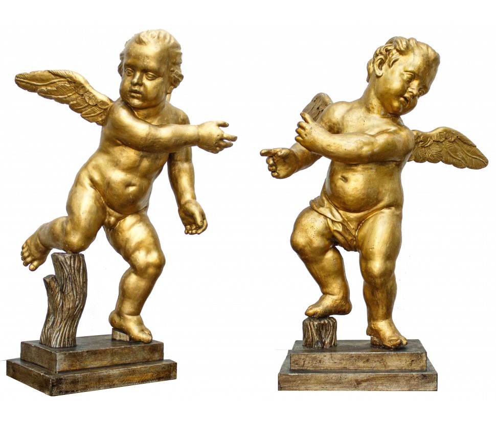 The two lovingly carved putti rest, the first a knee the second a foot, on a finely carved piece of wood. Their limbs are fleshy and abundant and the movements are exaggerated played on the theatricality and dynamism typical of the baroque: the first leaning on a knee looks straight to himself while with a sharp twist of the torso he carries an arm pointing towards his right; In the second, the face is directed to the opposite position of the arm while the torso remains fixed.