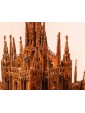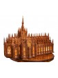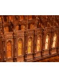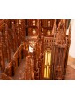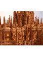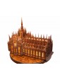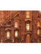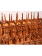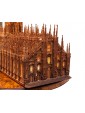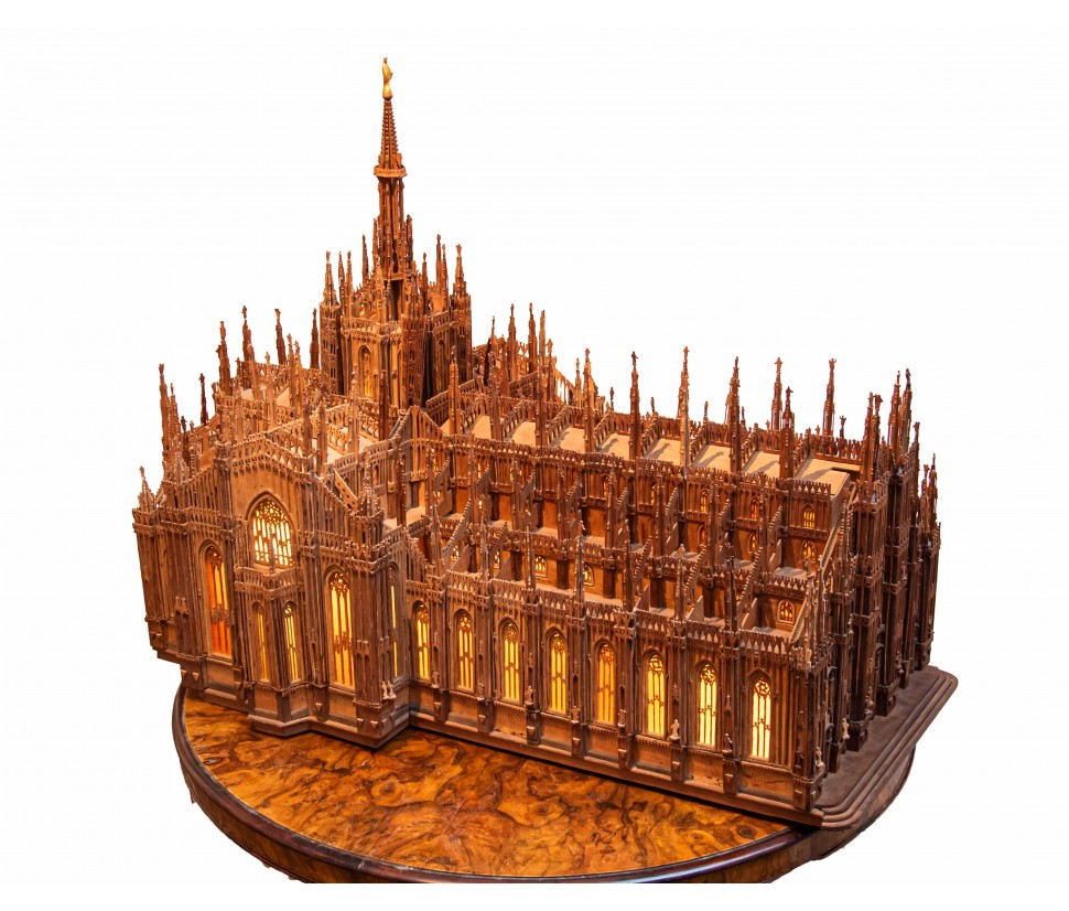The image shows an elaborate wooden model of the Milan Cathedral. The model faithfully reproduces the gothic architecture of the cathedral, with its wealth of spires, pinnacles, soaring arches and windows. There are numerous architectural details, from the stylized sculptures to the meticulous decorations that cover the surface. The windows are illuminated from the inside, thanks to a lighting system that simulates the striking effect of the light filtering through the stained glass windows of the Royal Cathedral. The perspective of the model emphasizes the grandeur and complexity of the structure of the cathedral meneghino, culminating with the major spire surmounted by the Madonnina. The craftsmanship is evident in the precision of the carvings and in the assembly of the various elements, making the model a true work of art in miniature. The model here taken into consideration, dated to the mid-nineteenth century, shares several similarities with other famous models of the Duomo of Milan, in particular with the Modellone of the Museum of the Cathedral of Milan and with the model exhibited at the exhibition "Il Genio di Milano" held at the Gallerie d'Italia in Milan. The three models share the didactic and illustrative intent, the use of wood as a construction material, the attention to the representation of fine details of Gothic and Neo-Gothic architecture, and the general expertise in carving and in the perforation of the wooden surface.