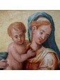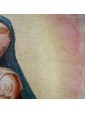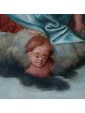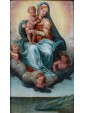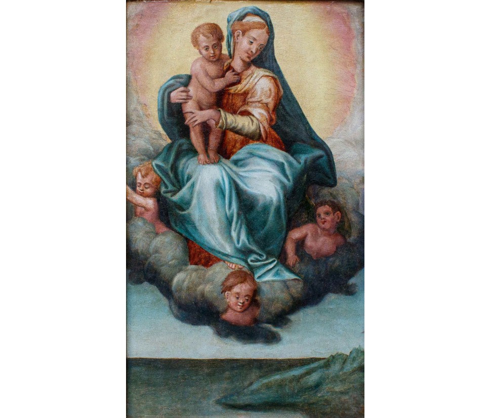 This Madonnai enthroned with child fits into the context of the Emilian tradition of the sixteenth century, a thread referred to by Antonio Allegri known as the Correggio (1489 - 1534)- It is to this last that the unknown author of this canvas must refer. Specifically, the influence of the background Correggio recalls to mind, which develops according to concentric light beams, more orange towards the outside and more and more golden towards the inside. This gradient of colors, designed by Correggio for the frescoes, of great illusionistic-perspective and scenographic effect, in the dome of San Giovanni Evangelista in Parma, allows to increase the spiritual aspect of the characters, placed on a cloud carried up by cherubim. The head of the virgin almost touches the highest limit of the canvas, adding to the composition the idea of ascensional motion. The lesson of the Correggio is also absorbed by the treatment of the face of the madonna, sweetened by the look down but also by the composed tenderness of the embrace with the son and by the light effects of the drapes and the cloud. The composition can be compared with La Madonna di San Sebastiano del Correggio at the Gemaldegalerie in Dresden, executed in 1524 and with La Madonna in gloria by Benvenuto Tisi detto il Garofalo (1476 or 1481 -1559), executed between 1510 and 1520, Now in the National Gallery of Parma. The figurative model of this Madonna with child in glory is also found in many more recent examples, although there are variations, such as the presence of the Saints to attend the ascension into heaven of the Virgin. More recent examples of the maintenance of this iconography are traced, always in the Emilian area, in artists such as Guercino (1591-1666) with the Madonna and Child in Glory, today at the National Gallery of Parma.