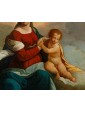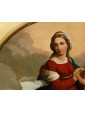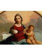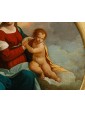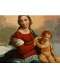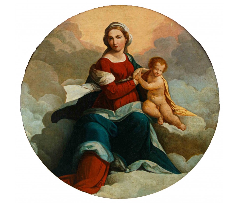 The work, dated around the mid-nineteenth century, is a brilliant reinterpretation of the stylistic iconography of one of the masterpieces by Benvenuto Tisi, called Il Garofalo, la Madonna con il bambino in gloria dei Musei Capitolini. The work of Garofalo, attributable to the mature phase of its production - there are clear influences related to the visual culture Raffaellese and, in general, Roman - is dated around 1525. This presents the Virgin with the Divin son surrounded by a choir of angels musicians: at the feet of the Madonna, suspended on a soft blanket of clouds with a light pink undertone, in the sixteenth-century painting of Tisi, opens a landscape of great charm, within which the presence of a pair of friars is recorded. The artist who, in the nineteenth century, reinterprets this subject chooses to focus solely on the performance of the central group, that with the Virgin and Child Jesus: in this way, it emphasizes the intimistic dimension of the image, Emphasizing the sweetness and depth of the mother-child relationship. In the nineteenth century there was a great interest on the part of artists and scholars for the painting of the Renaissance of Ferrara: many are the authors who look with interest to the paintings by Mazzolino, Dosso Dossi, Ortolano and Garofalo; among these is the Faentine Tommaso Minardi (Faenza, 1787 - Rome, 1871), artist who during the first years of his stay in Rome made some studies and oil paintings taken from the famous works of the masters of the Ferrarese Renaissance exhibited in museums and churches of the eternal city.Born in Veneto, probably between Carnaro and Garofalo, near Rovigo, it seems that Tisi was apprentice of Domenico Panetti from 1491. In 1495 he worked in Cremona under the direction of Boccaccio Boccaccino, who introduced him to the Venetian chromatic style, which became a key factor in his juvenile paintings. In 1500 he made his first trip to Rome, at a time when it was customary for northern Italian artists to make a formative trip to the eternal city. In 1501 he moved to Bologna where he stayed for two years at the workshop of Lorenzo Costa il Vecchio, a painter of great renown who worked for the Este and Gonzaga families. In 1504 he returned to Ferrara and worked with the Dossi brothers. Between 1503 and 1506 he received several commissions particularly significant in the Ferrara area: he frescoed, for example, the ceiling of the Sala del Tesoro in the Palazzo Costabili in Ferrara, inspired by Mantegna’s Camera degli Sposi. In 1512 he made a second trip to Rome, at the invitation of his fellow countryman Girolamo Sacrati, to the court of Pope Julius II, where he met Raphael. This encounter influenced his style, which changed from Lombard to classical and close to the influences of Sanzio and Giulio Romano. Around 1512 he returned again to Ferrara where he worked on numerous works for the duke Alfonso d'Este. Between the '20s and the '40s, Tisi was engaged in various commissions for the Este and in the realization of numerous altarpieces for the city of Ferrara. Benvenuto Tisi died in 1559 and was buried in the Ferrara basilica of Santa Maria in Vado in the locus built a few years ago next to that of his wife, who had died earlier. In 1829 his remains were transferred to the cemetery of the Certosa di Ferrara, where in 1841 a monument will be dedicated to him in the Cella degli Uomini Illustri, by the sculptor Angelo Conti.