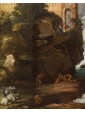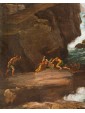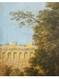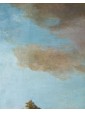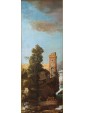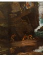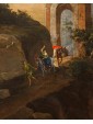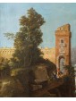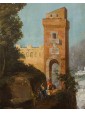 Various characteristics similar to the production of the prolific workshop of Charles François Lacroix de Marseille are found in this fascinating landscape. The painting shows a dramatic and suggestive coastal landscape, in which natural elements and curious architecture coexist harmoniously. The scene is dominated by a rocky cliff that rises over the rough sea on the right, where the waves crash against the shore. In the foreground, on the left, you can see human and animal figures in a rocky area, with cows lying flat resting. In the centre, the cliff is surmounted by a solid wall, probably part of a fortification or a wall, which extends horizontally. A large leafy tree grows on the top of the cliff, with its dense foliage protruding against the sky. On the right, emerges a massive tower of reddish color, with a large arch at the base and an upper structure that suggests a sighting or defense function. At the tower and along the road that climbs up the cliff, there are some human figures on horseback and on foot, suggesting a passing or travel activity. The sky is stormy and dramatic, with dark clouds thickening at the top and a fainter glow towards the horizon, giving the scene an intense and almost melancholic atmosphere. On the right, in the distance, you can see a profile of a city or a coastal settlement, with houses and structures descending towards the sea. The style of the painting, with its attention to light, atmospheric variations and dramatic composition, is characteristic of French artists of the eighteenth century who were influenced by Italian landscaping, in particular the Roman tradition, First of all Lacroix de Marseille. The presence of classical or pseudo-classical architecture and the representation of grandiose natural elements recall the teachings of Joseph Vernet and the interpretation given by Lacroix de Marseille, whose marine and coastal landscapes were a great success and were taken as models by many painters of the period.