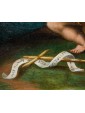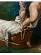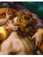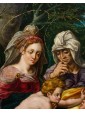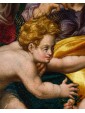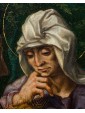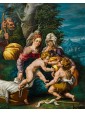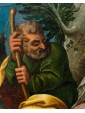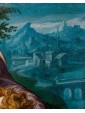 The glassy consistency, glacial in the hardness of the surfaces, identifies in this painting the all Flemish charm to which we must ideation and elaboration. The artist incessantly repeats the modular exercise of structuring surfaces, stopping now to sculpt the muscles of the Child Jesus and Giovan Battista, also children, now to bend sharp edges the smooth robes of Mary, Saint Elizabeth and Joseph. The landscape in the distance, with ocean colors, is cut of luminescence compared to the bright green of the hill on which the characters are resting. The bright yellow of Joseph and Elizabeth’s robes encircles Mother and Son, directing the viewer’s eye on the two main figures. Elizabeth, the Baptist’s mother, encourages her son with a slight touch on his back as he freezes and admires with boundless wonder Jesus, flying over his mother’s leg towards him. The white veil that softens the cradle of the Child is already an allegory of the white shroud of death and Resurrection; the wild herbs isolated by the artist in the right corner of the painting, as well as serving as a filler refer to the bitter herbs eaten by the Savior during the last supper, a traditional Jewish meal. Birth and Resurrection are still implicit narrative vehicles of the painting, examples with perfect golden aureoles as fine as an adult’s hair and the ray on the head of the Child, material proof of the celestial kingdom.