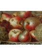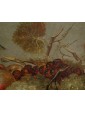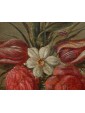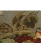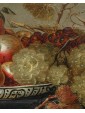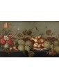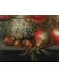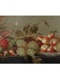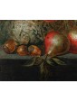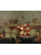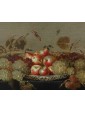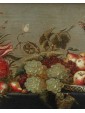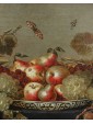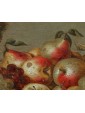 The composition under consideration is characterized by an elegant lightness. The fruit is spread freely on a stone sill, while some apples and grapes are presented inside a painted ceramic tray. A flower pot dominates the left side of the painting, breaking the horizontal trend and dynamizing the composition.