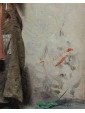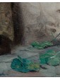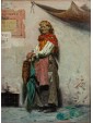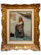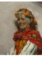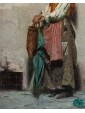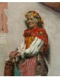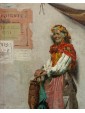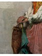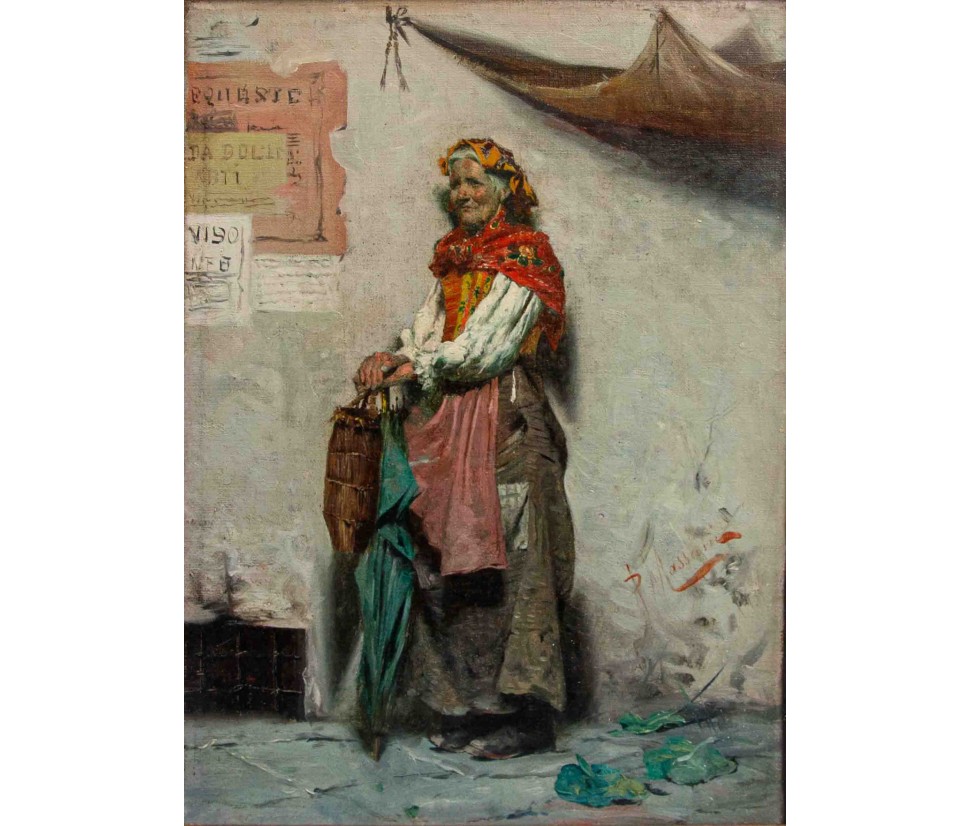 The painting in question shows an elderly female figure, presumably a commoner or beggar, standing and leaning against a rough wall. The work is an excellent example of Massani’s style, characterized by attention to detail and representation of everyday life, often with a touch of realism and dignity. The woman is the focus of the composition. Her face is marked by time, with deep wrinkles that testify to her advanced age. His gaze is directed towards the observer, with an expression that seems a mixture of resignation and dignity. On his head he wears a brightly coloured handkerchief, predominantly yellow and orange, which contrasts with the aged skin. Her dress is traditional and modest: she wears a white shirt with wide sleeves, covered by a colored bodice or waistcoat, with shades of red and yellow that add a touch of vivacity. On the shoulders it has a red shawl, full of folds and details that suggest an elaborate fabric. A pale pink apron covers the front of her skirt, which appears gray-brown, with a worn and patched appearance. Next to her, on the left, she also holds a wicker basket, an element designed to distinguish popular figures or street vendors. On the background wall are some torn and unreadable posters, which add a sense of authenticity and street life. Massani uses a visible and material stroke, especially in the rendering of clothes and background, which gives texture and depth to the painting. The colors are warm but sober, dominated by earthy and ocher tones, with accents of red, yellow and blue-green that capture the attention on the figure. The work conveys a sense of realism and an empathy for the subject, typical of Massani’s genre painting, who loved to explore people’s figures and their living conditions, while maintaining a certain dignity in representation.