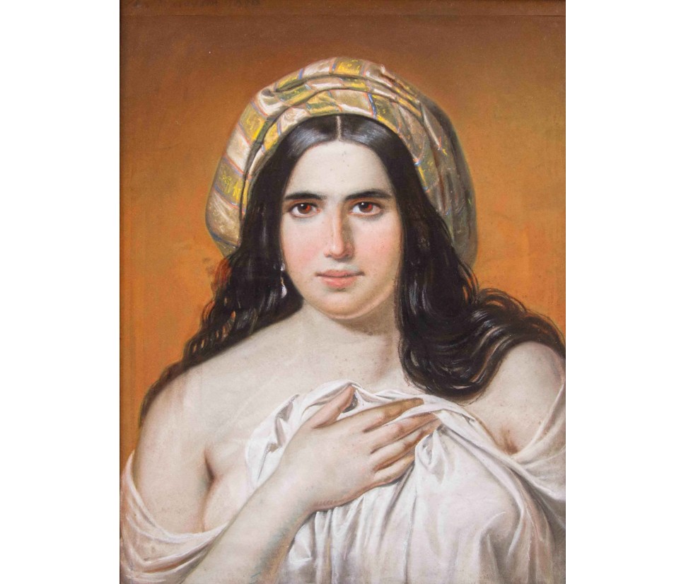 Natale Schiavoni (Chioggia, 25 April 1777 - Venice, 16 April 1858) was an Italian painter and engraver, best known for his portraits and genre scenes characterized by a delicate sensuality and elegant execution. Born into a family of artists - his father Felice was a painter particularly appreciated by his contemporaries -, Schiavoni initially trained in his father’s workshop. His early artistic inclination soon brought him to Venice, where he had the opportunity to study and get in touch with the main exponents of the artistic environment of the lagoon city. His career developed through different phases and influences. Initially linked to the Venetian pictorial tradition of the eighteenth century, with a particular attention to color and light, Schiavoni was able to carry out a profound evolution in his style, incorporating in his works elements characterizing neoclassicism and romanticism, dominant trends at the beginning of the 19th century. He became particularly popular for his portraits, in which he was able to grasp with sensitivity the personality and elegance of subjects, often members of the high society of his time. His female figures are characterized by an idealized beauty and an aura of refined melancholy. In addition to portraits, Schiavoni also dedicated himself to genre painting, creating intimate and graceful scenes, often with female figures in languid poses or in daily idealized contexts. His skill in drawing and attention to detail helped make these works particularly pleasing and refined. During his career, Schiavoni traveled frequently, staying in Trieste and Milan,where he worked as a portraitist and met important personalities of the cultural and aristocratic world. These trips broadened his artistic horizons and influenced his production. Returning to Venice, he continued his painting activity successfully until his death in 1858. His work remains a testimony of a period of transition in the Italian art scene, in which the Venetian tradition was opened to new sensibilities and influences. The Odalisca is certainly one of the most requested subjects by the aristocratic and upper middle-class clientele of the mid-nineteenth century; in fact, it was repeated on several occasions by the artist: exemplified in this sense appears the painting of the Revoltella Museum in Trieste (cat. 13), institution that of Schiavoni preserves five paintings. In this version, whose attribution to the artist from Chiozzotte origins has been confirmed by Fernando Mazzocca, the exoticism of surface - and so to say "masked" - of the usual half female figure merges with the eye-catching smile and intriguing look directed maliciously to the observer. The refined sensuality of the alabastrino bust, which stands out from the material effects of the precious fabrics, particularly fascinated the committenza of the time, who appreciated this segment of the production of Schiavoni. Although his production is extensive and includes works in oil, it is in pastel that Schiavoni has shown a peculiar sensitivity and delicacy, capturing with rare precision the nuances and expressions of his subjects. His pastel works are distinguished by the brightness of colors and the softness of textures, elements that give portraits and subjects of orientalist inspiration a remarkable vitality and a kind of transparency. Schiavoni was able to faithfully render the details of the fabrics, the shine of the jewels and, above all, the depth of the looks, revealing the psychology of the characters. His skilful use of pastel testifies to a deep knowledge of the potential of this medium, which he used to create works of great visual impact and remarkable refinement, helping to keep alive the tradition of pastel portrait in an era dominated by oil. The pastel works of Natale Schiavoni remain today precious testimonies of an art that combines technical virtuosity and deep aesthetic sensitivity.