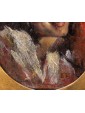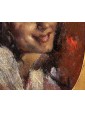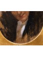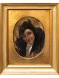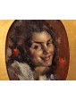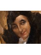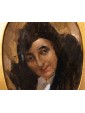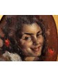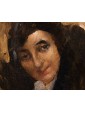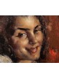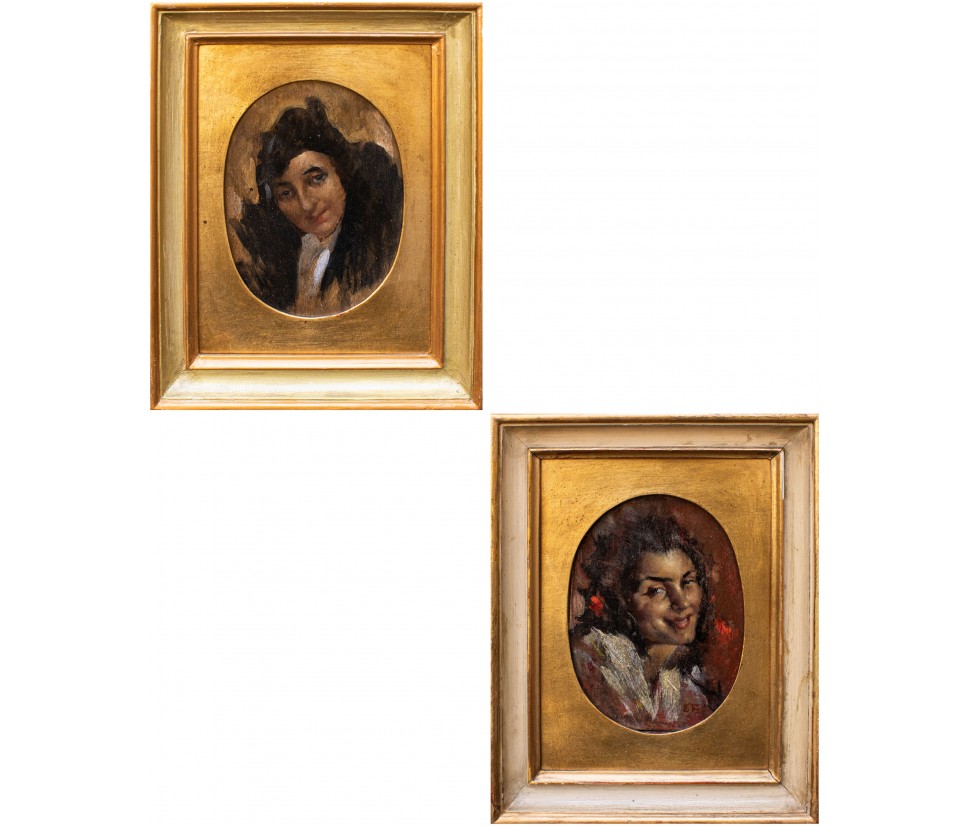 This pair of portraits shows two women directly facing the viewer. The winky and decisive look is reinforced by the used brush, snarling and participated, of vibrant intensity. The artist has decided to use a dark red background for one, golden for the other. A calcato chiaroscuro exacerbates the portraits of dramatic intensity, placing them in the groove of 19th century Verista production. The artist’s desire to represent women with vivid realism stands out in the smiling dimples of one and the intense gaze of the other.