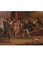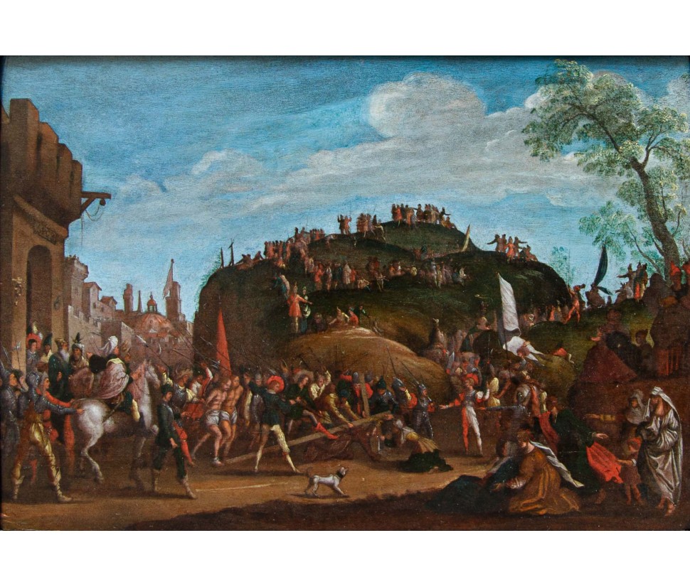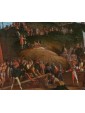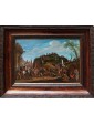 Legend tells of a young man of noble spirit, Jacques Callot, who, animated by an irrepressible passion for the figurative arts, disdained the comforts of a wealthy home to pursue the dream of Rome, cradle of the muses. Twice, challenging his father's authority, he moved away from his native roof to go to the court of the Duke of Lorraine, where the expectation of an existence more suited to his artistic ideals enticed him. Callot's career is divided into an Italian period (c. 1609 - 21) and a Lorraine period (France) (1621 until his death). In 1608 he was in Rome, under the expert guidance of the engraver Philippe Thomassin; here the young Callot began to refine his technique, dedicating himself to the reproof of majestic works, jealously guarded in the sacred homes of the Eternal City. With an almost painstaking acumen, he immersed himself in the study of Flemish masters and refined mannerists, absorbing their style and mastery. His artistic career experienced an unexpected splendor in 1612, when he was welcomed with enthusiasm at the sophisticated Medici court in Florence. In that environment of exquisite elegance, Callot's talent found fertile ground. With an incisive line and unparalleled wit, he gave life to a work rich in nuances, portraying scenes of everyday life with surprising truthfulness: exuberant fairs, opulent parties, representations of commedia dell'arte, grotesque figures and beggars, vain courtiers and hunchbacks with twisted faces. After the death of Duke Cosimo II in 1621, Callot returned to Nancy, where, in the service of the Lorraine court, he continued to paint and engrave, giving shape to imaginative visions and scenes of daily life. Unfortunately, most of his pictorial works have been lost, leaving us only an echo of his extraordinary abilities. In Nancy, the artist deepened his artistic research, tackling more challenging and mature themes. Alongside representations of worldly life, he dedicated himself to religious subjects, compositions that portrayed the horrors of war and landscapes of poignant beauty. In 1633, deeply shaken by the war events that shocked Europe and by the invasion of Lorraine by Cardinal Richelieu, Callot created a series of engravings that forcefully denounced the atrocities of the war called Les Grandes Misères de la guerre, composed of 18 prints published in 1633. His works, full of raw and painful realism, anticipate Goya's famous "Disasters of War" by almost two centuries, revealing a sensitivity and capacity for psychological analysis that place him among the greatest artists of his time. Caillot was able to develop a naturalistic style while preserving the artificiality of the occasion, organizing a composition as if it were a stage and reducing the figures to a tiny scale, each indicated by the smallest number of shots possible. This required a very fine engraving technique. His breadth of observation, his lively style of figure, and his skill in gathering a large moving crowd ensured for his engravings a lasting popular influence throughout Europe. The splendid panel presented here is the most faithful version of the engraving made by Jacques Caillot of the same subject. Each element is faithfully imaged with skill and skill.
