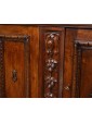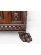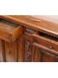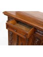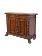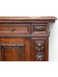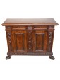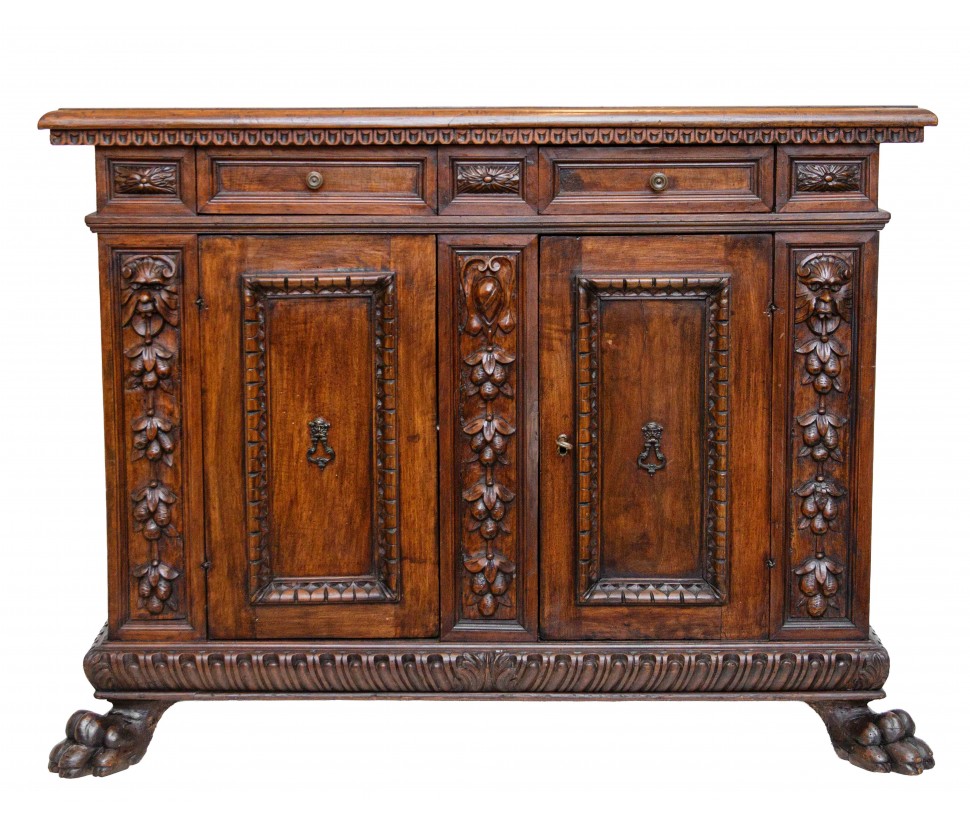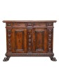 This Renaissance style sideboard is characterized precisely by the complex processing of the wooden material, in this case walnut, and by the symmetrical and orderly structuring of the decorations alternating with drawers and doors. The vegetal motifs that separate and surround the long parts of the two central doors end with two lion heads on the sides and with a coat of arms in the central strip; the prominence given by the depth of the carving makes these processes stand out above the others, more meticulous and contained: the edges of the doors and horizontal shelves, the lion-legged feet, typical of the Renaissance style and the foliage squares that separate the two small drawers above the doors. This furniture is precisely characterized by intricate carvings, floral and figurative motifs that draw inspiration from the forms of classical antiquity, with a harmony and symmetry that reflect the aesthetic ideals of the time. In the period between the end of the 19th century and the beginning of the 20th century, with the revival of historical styles, the Renaissance was also rediscovered and reinterpreted: the typical furniture of the Renaissance era was therefore produced again, returning to populate bourgeois homes - where craftsmanship and the ancient charm of this kind of furniture, such as chests of drawers, monumental beds, Savonarola chairs and the door furniture, or the sideboard; the latter accompanied by multiple drawers and doors and usually just under one and a half meters high finds the precise characteristics of the traditional style in the example presented here.