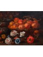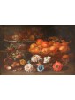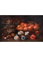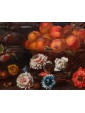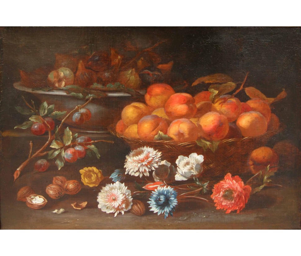 In Van der Cabel's other works in this genre, we find the characteristic style of the fruit baskets, as well as the addition of opened fruits, such as shelled walnuts, and a preference for specific ones like peaches and plums. Born and raised in Rijswijk, near The Hague, Cabel trained under the guidance of Jan van Goyen. His career took him to Paris early on in 1655 and to Lyon (c. 1655-58), where he settled at a young age and spent most of his life. However, he lived in Rome between 1659 and 1666, where he updated his studies and his knowledge of Italian art and that of the Flemish artists present in the Eternal City. He also became part of their community, known as the Bentvueghels, among whom he was known by the nickname "Geestigheid," or "humor," which emphasized his joyful and sharp wit. Furthermore, here he became one of Codazzi's regular collaborators, as demonstrated by an architectural piece preserved at the Uffizi Gallery.