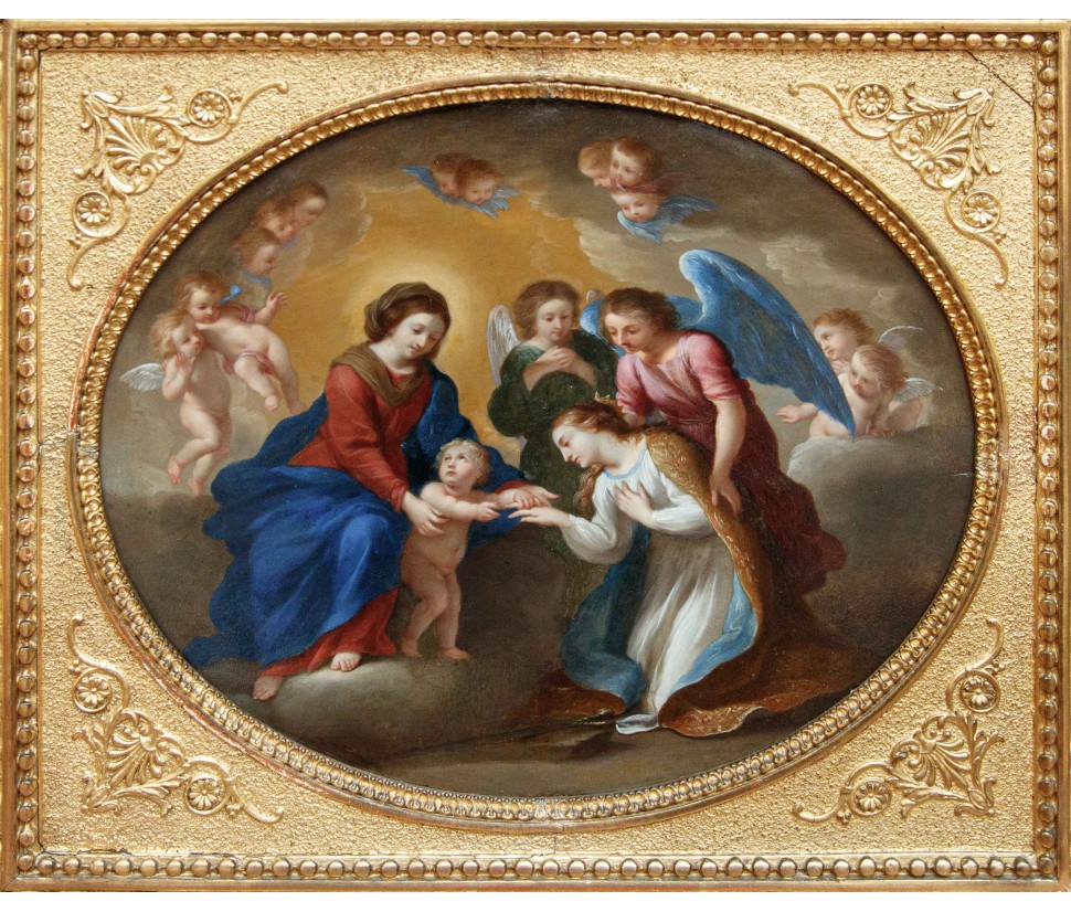Louis Cousin is better known as Luigi Gentile or Luigi Primo Gentile, a nickname bestowed upon him due to his "refined appearance". Following his initial training in Paris, he moved to Rome in 1626, where he joined the Schildersbent, a mutual assistance society for Dutch and Flemish artists. In Rome, Gentile was a protégé of the sculptor François Duquesnoy, who enjoyed great prestige in the city. His peers also recognized his significant merits, inducting him into the Virtuosi del Pantheon and electing him to two terms as Principe of the Accademia di San Luca between 1651 and 1653. In 1646, he worked for Pope Innocent X Pamphili. According to Roman documentation, the painter produced no fewer than twenty-seven paintings for the Pontiff—notably during the same period in which Diego Velázquez was present at the papal court to execute his famous portrait during his second Roman stay. Examples of these papal commissions include the Annunciation in the Museum of the Order of St. John, London (featuring a frame by Francesco Perone based on a design by Alessandro Algardi) and the Presentation of Jesus in the Temple (Convent of the Carmelites, Alba de Tormes, Salamanca). His Portrait of Don Giacomo di Barthos (Galleria Nazionale d'Arte Antica, Rome) is dated 1652. It was likely during this period that he participated, alongside compatriots and the most celebrated artists of the day—such as Pietro da Cortona and Carlo Maratta—in the decoration of Antonio degli Effetti’s studiolo, contributing a painting on copper (as yet unidentified) representing Neptune and Amphitrite. Further examples of his portraiture include the Portrait of an Anconitan Gentleman and Lady in the Walters Art Museum, Baltimore, which represent the pinnacle of the artist's Marche period. The extensive series of works executed for the Moncada family suggests a potential Sicilian sojourn, during which the painter appears to have been engaged in commissions of an encomiastic nature; these are miniaturized pictorial modelletti painted on copper, intended as precursors to tapestry translations. By June 1661, however, he was registered in the Brussels guild. According to Passeri (1772, p. 244), he worked for the King of Spain as both a painter and a tapestry designer, and executed several paintings for Archduke Leopold Wilhelm of Austria (the Venus and Adonis now in the Kunsthistorisches Museum, Vienna, originates from the Archduke's collection). The copper under consideration is a consistent addition to the Flemish master’s corpus of small-format paintings. The work reveals an indisputable stylistic and technical affinity with the Annunciation executed for Pope Innocent X, echoing its minute and vibrant brushwork. Furthermore, the painting offers precise parallels with several autograph compositions, starting with the formal references found in the Allegory of the Rivers (Neptune and the Water Cycle) in the Pushkin Museum. Particularly significant is the comparison with the Nativity in the Church of the Capuchins in Pesaro, from which the physiognomy of the angelic figure appears to be derived with almost literal precision. Chromatically, the execution is distinguished by the brilliance of the reds and blues—characteristic elements of "Gentile's" palette. This coloristic register finds resonance in other mature works, such as the Virgin Presenting the Child to Saint Anthony (Basilica of San Marco al Campidoglio, Rome) and the Samaritan Woman at the Well (private collection), confirming the attribution and placing the painting within the artist's highest period of production.