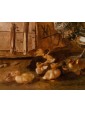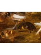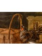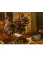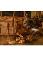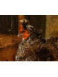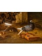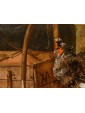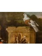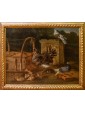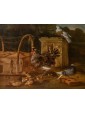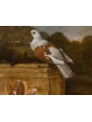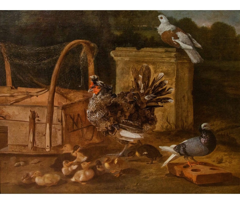 This refined living nature is part of the work of Jacobus Victor, a Dutch painter active in the 17th century who specialized in depicting farmyard animals, pigeons, and birds of various species. The work is part of the solid tradition of vogelstukken, a genre in which the artist excelled thanks to his keen observation skills and meticulous, brilliant rendering of plumage, light reflections, and animal movements. The canvas, signed with the Italianized form of the name—Jacomo Victor—can likely be dated to the 1670s. The scene is set in a farmyard: on the left, part of a wooden birdcage can be seen. In the foreground, a brood of chicks is moving about: overseeing this lively swarm is a hen portrayed in profile, probably an ornamental Frizzle breed hen, characterized by its distinctive curly plumage. The right side of the composition is dominated by two pigeons, a recurring subject in the painter's repertoire (Hamburg, Kunsthalle; Brussels, Royal Museum of Fine Arts): one, with gray plumage, perches on a perforated brick, while the other, with reddish plumage, rests on a fragment of an antique-style base. A soft, diffused light, atmospheric in quality, defines the volumes and makes the surfaces of the feathers vibrate with an almost tactile delicacy. The color ranges, set in shades of gray, brown, and pearl, show the strong influence of Venetian painting, particularly that which in the 17th century influenced many Northern painters attracted by the Bassano tradition and the style of animal painting of Giovanni Agostino Cassana. Jacobus Victors was born around 1640 to Louis Victor and Maria Paeuw; he was the half-brother of the better-known Jan Victors, a pupil of Rembrandt, and brother of the painter Victor Victors. According to critical tradition, Victor trained in the workshop of Jan Baptist Weenix, where he was able to work alongside Melchior Hondecoeter, the great master of bird painting. It is documented that Victor spent time in Italy, probably in the years immediately preceding 1670: he is mentioned in Venice as early as 1663 by Martinioni, who describes him as “Jacopo Fichtor of Holland... admirable in his depiction of flying animals.” On the back of the canvas is a label from Lenygon and Morant Inc., a prestigious Anglo-American company active between the 19th and 20th centuries, renowned for its production of period furniture and its ability to recreate complete interiors. The company, founded by Francis H. Lenygon, distinguished itself by acquiring entire period complexes, including a Dutch Painted Room from Groningen, demonstrating a strong interest in 17th-century Dutch art. The work reveals a harmonious fusion of observation from life and compositional elegance, presenting the viewer with a small rural theater animated by lively and familiar presences.