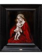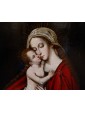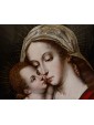 In this painting, the Virgin, depicted with an aura of mystical serenity, invites us to an intimate dialogue between faith and art. Sitting on a throne, she holds the Child close in a tender embrace. Their faces, with delicate features, express a deep maternal bond. The golden light enveloping the pair creates an atmosphere of warm intimacy, in contrast with the dark background.