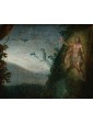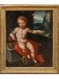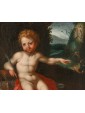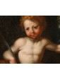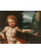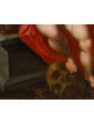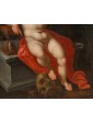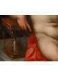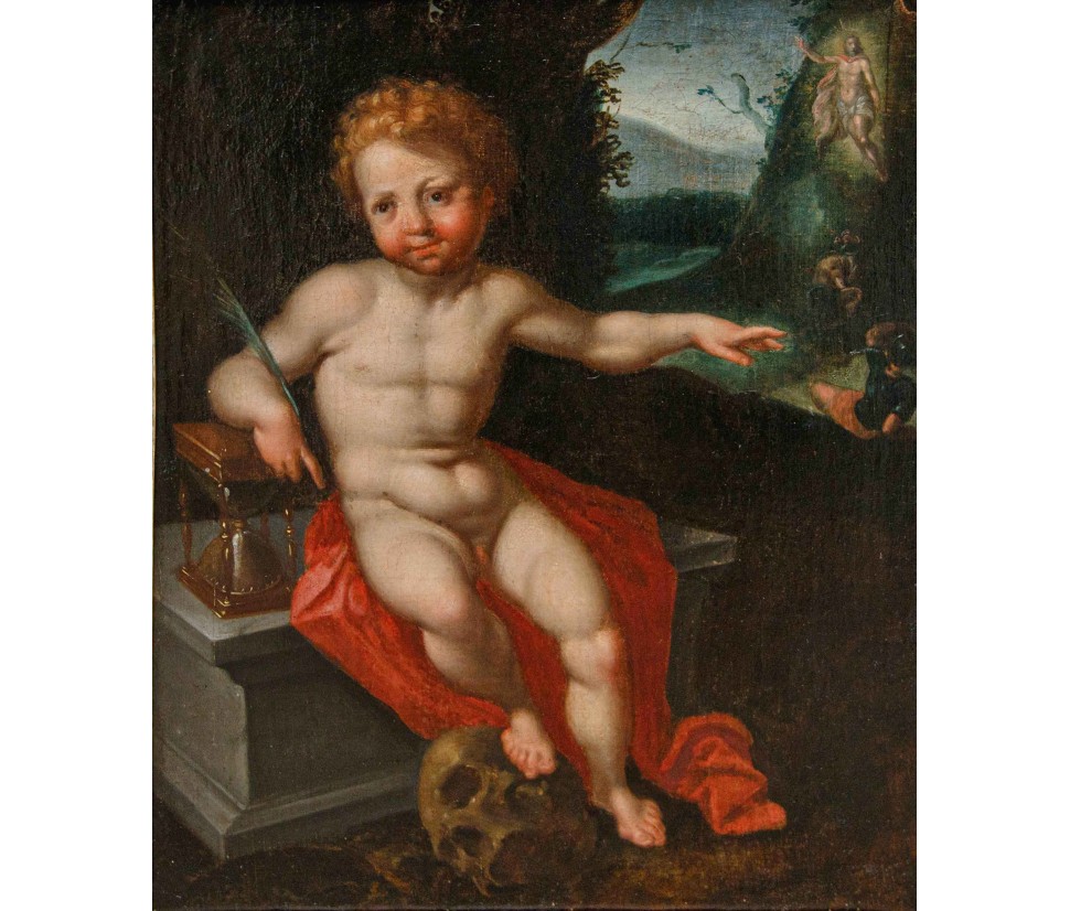 The painting depicts a young nude boy seated on a stone plinth. His body, solid and sculptural, is rendered with meticulous attention to anatomical modeling, while his pose introduces a complex symbolic system: his right foot rests upon a skull, an overt allusion to death, while his right arm leans against an exhausted hourglass, an emblem of elapsed time and the transience of existence. These elements clearly belong to the repertoire of the Vanitas, a central theme of moral reflection between the 16th and 17th centuries. The gesture of his right arm, extending toward the background, invites the viewer to observe the scene behind him, where the Resurrection of Christ is glimpsed—the only possible answer to the human finitude evoked in the foreground.