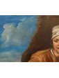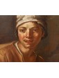 The Young Fishmonger stands as one of the most persuasive examples of the artistic maturity of Giacomo Francesco Cipper, known as il Todeschini. This large-format oil on canvas depicts a youth intent on weighing a catch on a scale—a captured moment of daily life that serves as a pretext for a broader pictorial reflection on concrete reality and the value of manual labor. The figure emerges powerfully in the foreground, occupying nearly the entire compositional space, while the background is reduced to an essential, barely suggested landscape glimpse that provides depth without distracting from the narrative focus.
