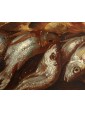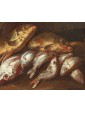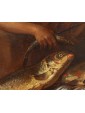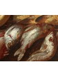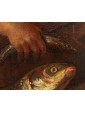 However, the true visual protagonist of the work is the still life of fish arranged in the foreground. The jumble of different species, rendered with almost analytical precision, allows the painter to showcase extraordinary descriptive skill: iridescent scales, moist flesh, and silvery or pinkish reflections are conveyed with a direct naturalism that eschews decorative indulgence. The palette, dominated by warm and earthy tones, is enlivened by sudden flashes of light that animate the paint and lend vitality to the whole.