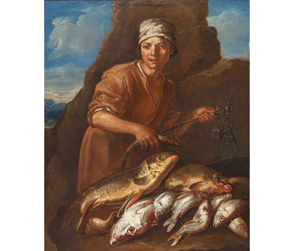 In this regard, comparisons with the two Still Lifes with Fish formerly in the Gastaldi Rotelli collection are particularly compelling, as they share similar compositional solutions and the same meticulous attention to ichthyic detail. Even more significant is the comparison with The Fishmonger's Stall and a Greengrocer, now at the Royal Palace of Caserta: some of the fish depicted in the large Caserta canvas appear to have been executed using models nearly identical to those in the Young Fishmonger, suggesting the artist drew from a consolidated formal repertoire, reusing and varying it within different narrative contexts.