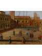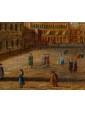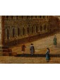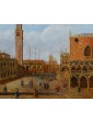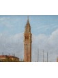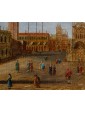 The artist chooses to populate the square with numerous figurine (small figures) of popular flavor, rendered with rapid and lively touches of color. These characters, dressed in the fashions of the time or in costumes recalling 18th-century traditions, lend the scene a sense of everyday vitality, transforming the architectural view into an urban narrative. The atmospheric rendering is dominated by a clear, crisp light, typical of a Venetian morning, which enhances the architectural volumes and creates sharp shadows on the pavement. The palette favors warm ochre tones, harmonized by a blue sky dotted with white clouds.