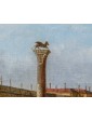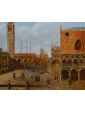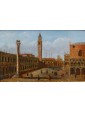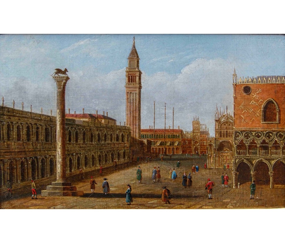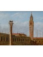 The painting offers a view of Piazzetta San Marco from a slightly elevated vantage point, allowing the observer to take in the symbols of Venetian power and history. On the left, the perspective is defined by the solid mass of the Sansovinian Library, whose classical arches lead the eye toward the center of the composition, where the imposing St. Mark’s Campanile stands tall. In the foreground, the column topped by the winged Lion—symbol of both the Evangelist and the city itself—is prominently featured. To the right, the Gothic façade of the Doge’s Palace emerges, characterized by its distinctive pinkish masonry and traceried loggia, which leads towards St. Mark’s Basilica, partially visible in the background.