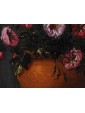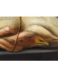 The second canvas, Still Life with Vase of Flowers, Walnuts, Mortar, Plucked Turkey, and Salmon, expands the iconographic range by introducing a more complex setting. The table is positioned in front of a wooden plate rack and a wall where metal kitchenware hangs, elements that structure the space and provide perspectival depth. In the foreground, a bronze vase holds roses and buds in pinkish tones, placed alongside a stone mortar with a pestle and scattered walnuts, while a plucked bird, tied with string, lies next to a salmon fillet resting on a plate atop a copper vessel. The compositional order, far from being accidental, demonstrates an academic awareness in the arrangement of objects, organized according to a carefully weighed volumetric progression.