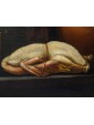 The first canvas, Still Life with Fish, Game, and Vegetables, is set within a dark environment, constructed through a dense brown background that absorbs light. The objects emerge thanks to a raking light entering diagonally from the side. Arranged on a barely perceptible table are silvery-fleshed fish, a bird, and two baskets overflowing with vegetables. The composition is carefully balanced: the taller, more abundant basket on the right offsets the more compact terracotta one on the left, while the fish and game create a stabilizing horizontal line. The attention to the tactile rendering of surfaces—the glossy scales, the soft feathers, the woven wicker—reveals a thin, polished brushwork, devoid of the material impasto characteristic of Levoli’s painting, suggesting a more controlled and academic approach.