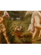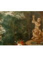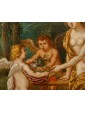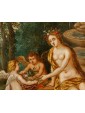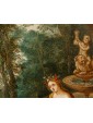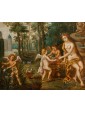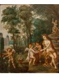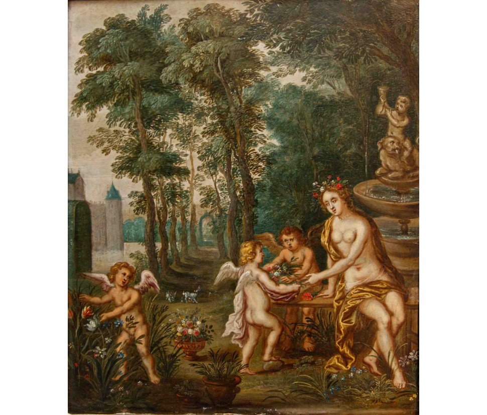 In this oil on copper, Flora, the Italic goddess of spring, is depicted seated on the edge of a fountain. She is portrayed nude, draped only in a golden cloth and a garland of flowers crowning her long chestnut hair. The scene is completed by three winged putti, also depicted nude, who are busily gathering flowers in honor of the goddess.
