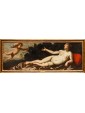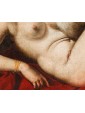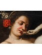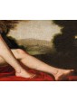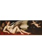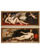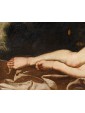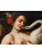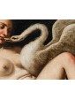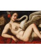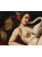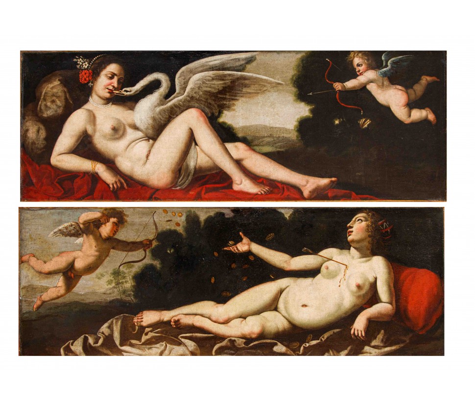 This pair of paintings illustrates two of the mythological themes most beloved in the figurative culture of the time, centered on the amorous metamorphoses of Jupiter. The first episode depicts Leda, sensually reclined on a red drape as she yields to the kiss of the swan—the form assumed by the father of the gods to seduce her. According to myth, their union gave rise to the Dioscuri (Castor and Pollux) and Clytemnestra. The stylistic hallmark of the composition appears as an explicit homage to Michelangelo’s celebrated invention for Alfonso d’Este, an essential model for the success of this subject in the modern era.