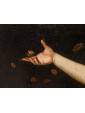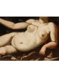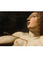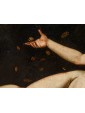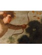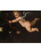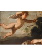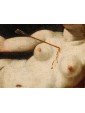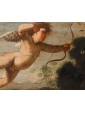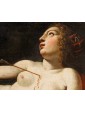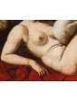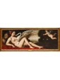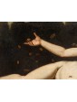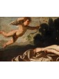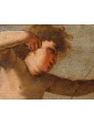 In the second canvas, the princess Danaë is portrayed at the myth's climax: pierced by Cupid’s arrow, she is impregnated by the shower of gold, another divine manifestation of Jupiter. Here too, the scholarly references are evident: the pose of the putto precisely recalls the youth appearing in Guido Reni’s Aurora, testifying to a refined visual culture indebted to the great Baroque and Renaissance traditions.