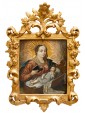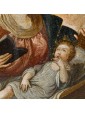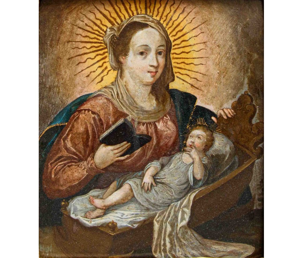 In this small-scale oil on copper, the richly dressed Virgin, holding the book of Holy Scriptures in her hands, watches over the docile Christ Child, who lies asleep in an elaborate wooden cradle.