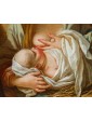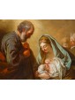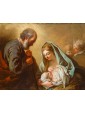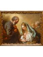 The work portrays the Virgo Lactans iconography with profound humanity and naturalism: at the center of the composition, the Virgin is enveloped in a blue mantle as she holds the Christ Child, captured in the act of nursing. Light cascades from the upper left, modeling the volumes and igniting the palette with a quality that is not merely functional for plasticity, but imbued with a sacred resonance. On the left, Saint Joseph observes the scene in an attitude of humble, deep meditation, leaning on his staff. His browner, weathered complexion intentionally contrasts with the ivory smoothness of the Virgin’s face, while in the background to the right, two cherub heads emerge from the clouds, participating in the supernatural dimension of the event.