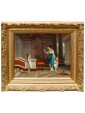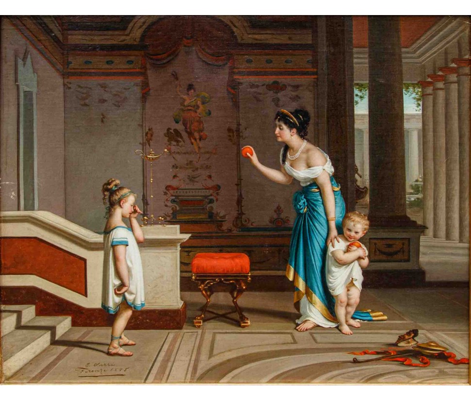 This refined canvas by Egisto Sarri (Figline Valdarno, 1837 – Florence, 1901), signed and dated 1875, represents one of the zeniths of the Tuscan master’s genre production. It fits with aristocratic poise into the successful vein of Neo-Pompeian painting that enjoyed such immense popularity among European collectors in the second half of the 19th century. The work—sold at Christie’s New York in 1997 and published in Moreno Bucci’s monograph—stages an intimate domestic narrative transposed into an idealized classical antiquity, where architectural monumentality merges harmoniously with the sincerity of human affection.
