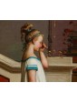 The scene unfolds in an interior rendered with near-archaeological precision. The rigor of the Doric columns and the mural decorations serve as a stage for a small, everyday drama. Sarri does not limit himself to a generic ancient setting; rather, he reconstructs a Pompeian interior with extreme philological skill, drawing directly from the archaeological discoveries that were fueling the European collective imagination at the time.