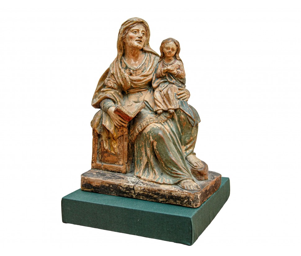 This terracotta sculpture is a typical example of 18th-century Neapolitan domestic devotion. The group depicts the Education of the Virgin, a theme deeply cherished in local tradition, rendered here with an almost theatrical immediacy.