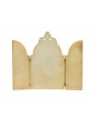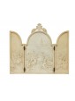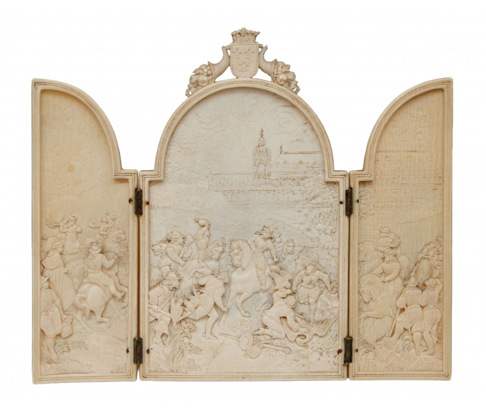 This precious 19th-century ivory triptych stands as a refined artifact of Historicist craftsmanship. It features three arched panels narrating a dynamic royal hunting scene, dominated at the center by the figure of a monarch on horseback—likely identifiable as the Sun King, Louis XIV. His majestic equestrian iconography is enhanced by the sculptural carving of volumes and anatomical details.