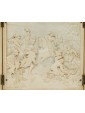 The finely engraved architectural profile in the background, recalling the structures of the Châteaux of Fontainebleau or Versailles, serves as a scenographic backdrop for the action. The upper pediment is further embellished with the heraldic coat of arms of the French monarchy featuring the three fleurs-de-lis, surrounded by cornucopias symbolizing royal prosperity.