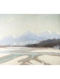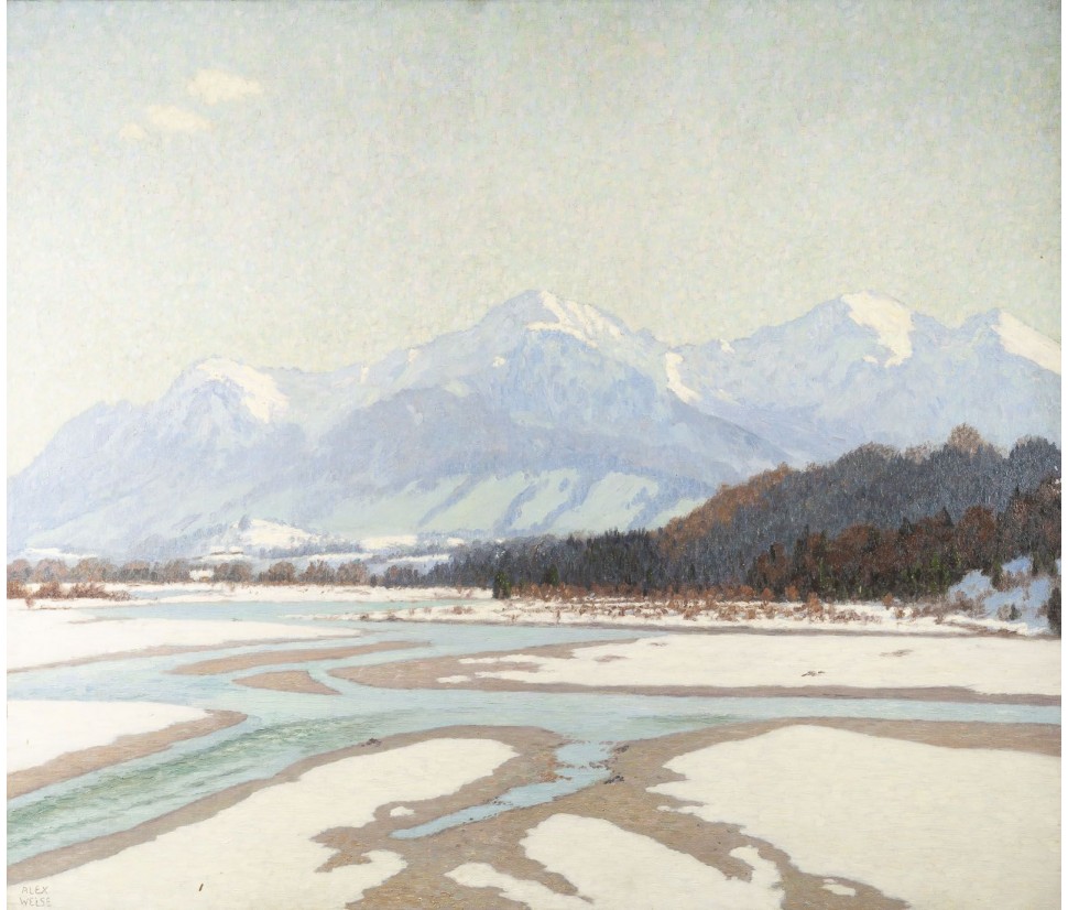 The canvas Winter Landscape with River by Alexander Weise represents a masterful testament to late-Impressionist landscape painting, focused on the majesty of the Bavarian Alps. In this painting, the viewer's eye is led along the winding course of a river that meanders between snowbanks and patches of emerging earth, creating a horizontal dynamism that balances the verticality of the peaks in the background. The color palette is dominated by cold and luminous tones, where the dazzling whites of the snow interact with the clear blue of the sky and the violet hues of the distant mountains. A thick band of forest vegetation, rendered with dark and textured brushstrokes, acts as a visual hinge between the frozen plain and the imposing mountain range, lending depth and atmospheric realism to the scene. The light, diffused and crystalline, perfectly captures the essence of a high-altitude winter day, revealing that refined sensitivity to natural phenomena for which the author is renowned.