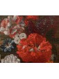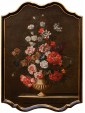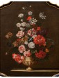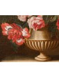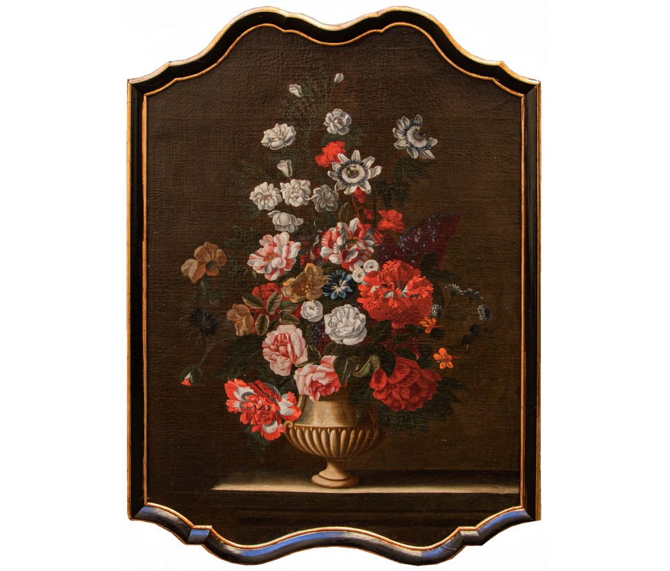 The elaborate profile of alternating lobes of this canvas hints at the preciousness of the floral composition presented to the viewer. A raking light cuts across the marble ledge from the front, falling directly before the vase and highlighting the sharply defined flower corollas that emerge powerfully from a theatrical dark background. The fluid formal geometry that defines the flowers, arranged in a calm coloristic syntax, does not shy away from revealing the most refined species: red peonies alternate with roses, variously striped carnations, anemones with filamentous petals, and perhaps centifolia roses. It is precisely this particular variety of cut flowers, together with the solid, rhythmic plasticism of the corollas and the antique-style relief decoration on the historiated vase, that allows this artistic language to be associated with the specific culture fostered by the legacy of Jean-Baptiste Monnoyer.