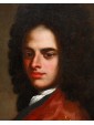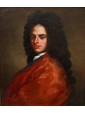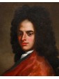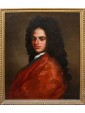 Portrait of a Gentleman is a work attributed to the Friulian painter Sebastiano Bombelli, likely executed during the mature stage of his career—a period in which Venetian portraiture was increasingly moving toward the refinements of the 18th century. The painting depicts the subject with his torso in profile, while his face turns in a three-quarter twist toward the viewer, establishing an immediate and penetrating eye contact. The man wears a sumptuous red overcoat, its folds animated by golden and iridescent highlights that emerge boldly from the dim shadows of the background. Beneath the heavy garment, the crisp white shirt collar is visible—a touch of pure light that frames the neck and serves as a chromatic bridge to the flesh tones. The head is crowned by an imposing and voluminous dark hairstyle, a wig with thick, glossy curls typical of the courtly fashion of the time, which lends solemnity and volume to the figure. The rendering of the face is masterful: the fair, almost diaphanous skin is applied with a soft brushstroke that models the volumes without stiffness. The background, initially dark and deep, gradually lightens around the silhouette of the gentleman, creating a luminous aura that lifts the image from the surface and grants it an almost sculptural dimension.