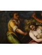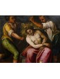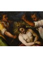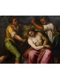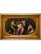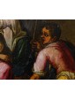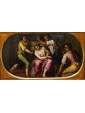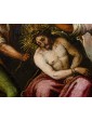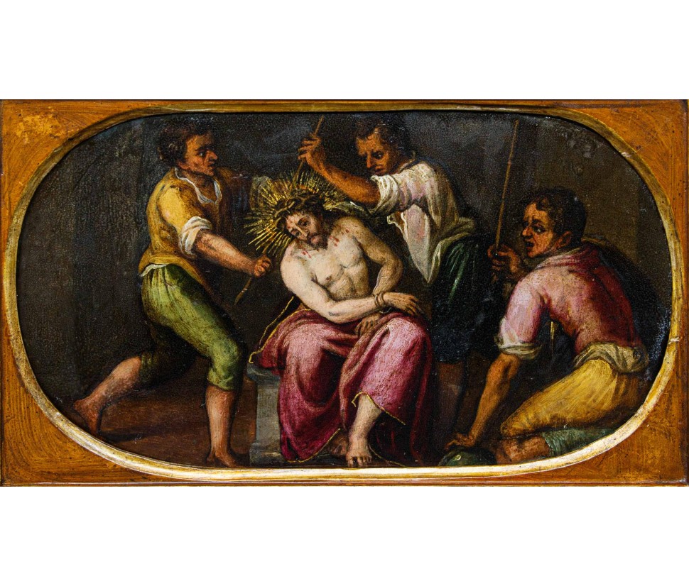 This refined late 16th-century oil on copper represents an emblematic work of Tuscan figurative culture, distinguished by the preciousness of its metallic support, which grants the pictorial layer a vitreous luminosity and exceptional pigment preservation. The painting illustrates the evangelical episode of the Crowning with Thorns with intense dramatic participation—a central moment of the Passion in which Christ, seated with his hands bound, undergoes the torment inflicted by his executioners. The composition is organized around the central figure of the Redeemer, draped in a purple mantle with tormented folds, while three male figures surround him, acting with studied, almost choreographic gestures: two of them use staffs to press the crown of thorns onto Jesus' head, while a third, on the right, observes the scene with an expression charged with psychological tension.