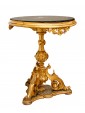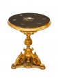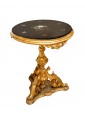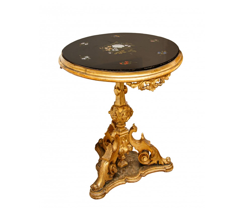 While the magnificent Chapel of the Princes in San Lorenzo represents the monumental peak of this tradition, high-quality artifacts like this 19th-century table testify to the persistence of Florentine taste and craftsmanship over time. The top rests on a tripod base of richly carved wood, gilded in leaf, which culminates in scroll volutes and foliate decorations typical of the eclectic 19th-century style. This base provides the piece with solid stability and an aura of opulent preciousness. The central shaft, also gilded, features an original nodule decorated with polychrome blue and green enamels, further highlighting the refinement of the materials and the complexity of the workmanship.