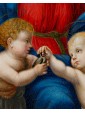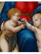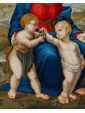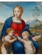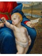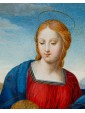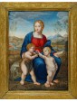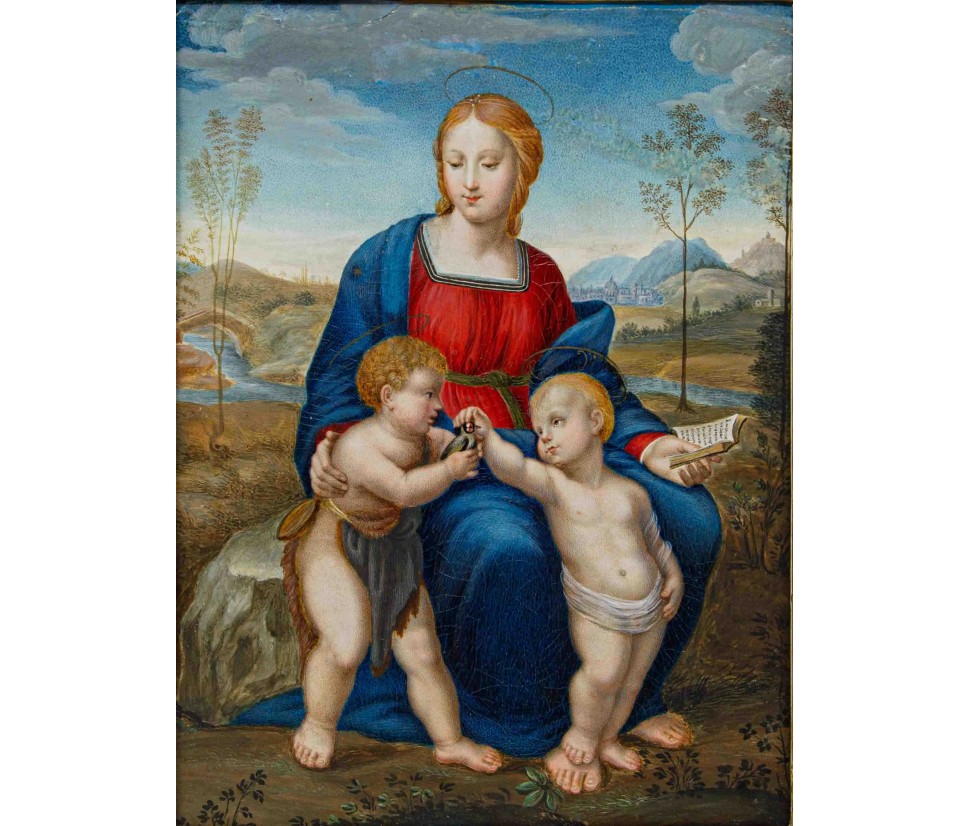 This refined work on vellum, dating back to the 18th century, is firmly rooted in the sophisticated Neoclassical tradition. During this period, the reproduction of Renaissance masterpieces was viewed not as a mere technical exercise, but as an act of aesthetic devotion and philological study regarding the canons of ideal beauty. The piece reproduces with meticulous skill Raphael's celebrated Madonna del Cardellino, an iconography that enjoyed renewed popularity in the 1700s thanks to the rediscovery of Classicism and the pursuit of graceful, pyramidal compositional harmony. This harmony is faithfully restored here through the sweetness of the faces and the silent dialogue between the Virgin, the infant Saint John, and the Christ Child.