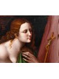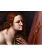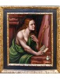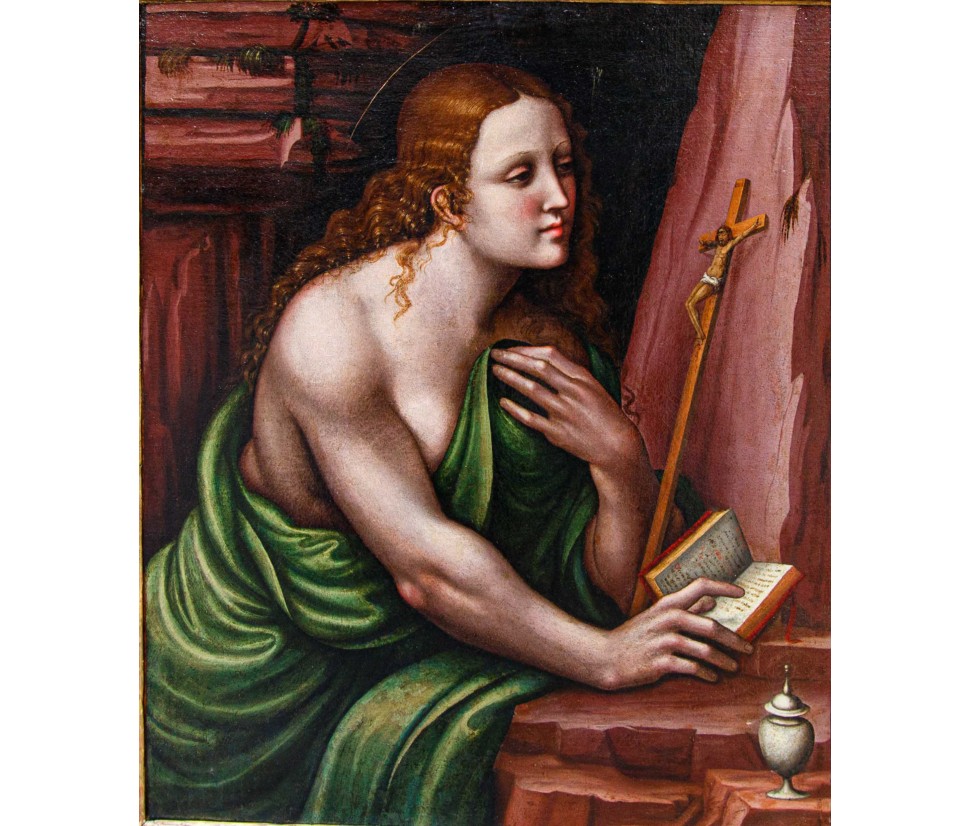 The painting under examination, depicting a Penitent Magdalene, belongs to the fertile tradition of Leonardo’s followers in Milan during the first half of the 16th century and is a work by the so-called Pseudo-Giampietrino B, an artistic personality who was distinct from but operated steadily within the workshop of Gian Pietro Rizzoli, known as Giampietrino. This figure of a collaborator, isolated by modern critics to distinguish stylistic variations from those of the master, reproduces here an iconography of extraordinary commercial and devotional success, for which the prototype preserved at the Accademia Carrara in Bergamo represents one of its absolute zeniths. Giampietrino’s work is characterized by a systematic idealization of the female figure, filtering Leonardo’s legacy through an aesthetic of polished composure that finds its highest expression in cycles dedicated to famous women of both sacred and profane history. Through subjects such as Mary Magdalene, Saint Catherine of Alexandria, and Lucrezia, the artist codifies a canon of beauty with sculptural features and a vibrant emotional charge, where the skillful use of sfumato lends the flesh an almost enameled luminosity. These figures, portrayed with a grace that oscillates between devotional mysticism and tragic sensuality, bear witness to the painter's ability to transform the Vincian model into a distinctive stylistic brand, rendering his heroines timeless archetypes of the Lombard Renaissance. Compared to Giampietrino’s Bergamo version, where the saint's face is immersed in a soft and melancholic sfumato, the work of Pseudo-Giampietrino B reveals a different plastic sensibility that translates into an almost sculptural anatomical rendering, particularly evident in the definition of the forearm and shoulder, which appear more solid and less atmospherically fused. The organization of Giampietrino's workshop involved the systematic use of preparatory cartoons replicated with minimal variations to satisfy an aristocratic clientele desiring images of intense beauty and formal rigor; in this context, Pseudo-Giampietrino B emerges as a high-level executor, capable of maintaining the elegance of the original model while adopting a more graphic touch and drapery with almost metallic folds, as seen in the emerald green mantle enveloping the figure. Characteristic of his painting are a marked plasticity in the treatment of anatomy, a more accentuated use of chiaroscuro, and a subtle tendency toward a more pronounced physiognomy in the faces, balanced by his skill in rendering the gold of the hair with small touches of color. The painter treated this same composition of the Magdalene, derived from the aforementioned Carrara model, in two other versions: that of the Museo Horne in Florence and that of the collection of the Earls of Wemyss and March in Scotland.
