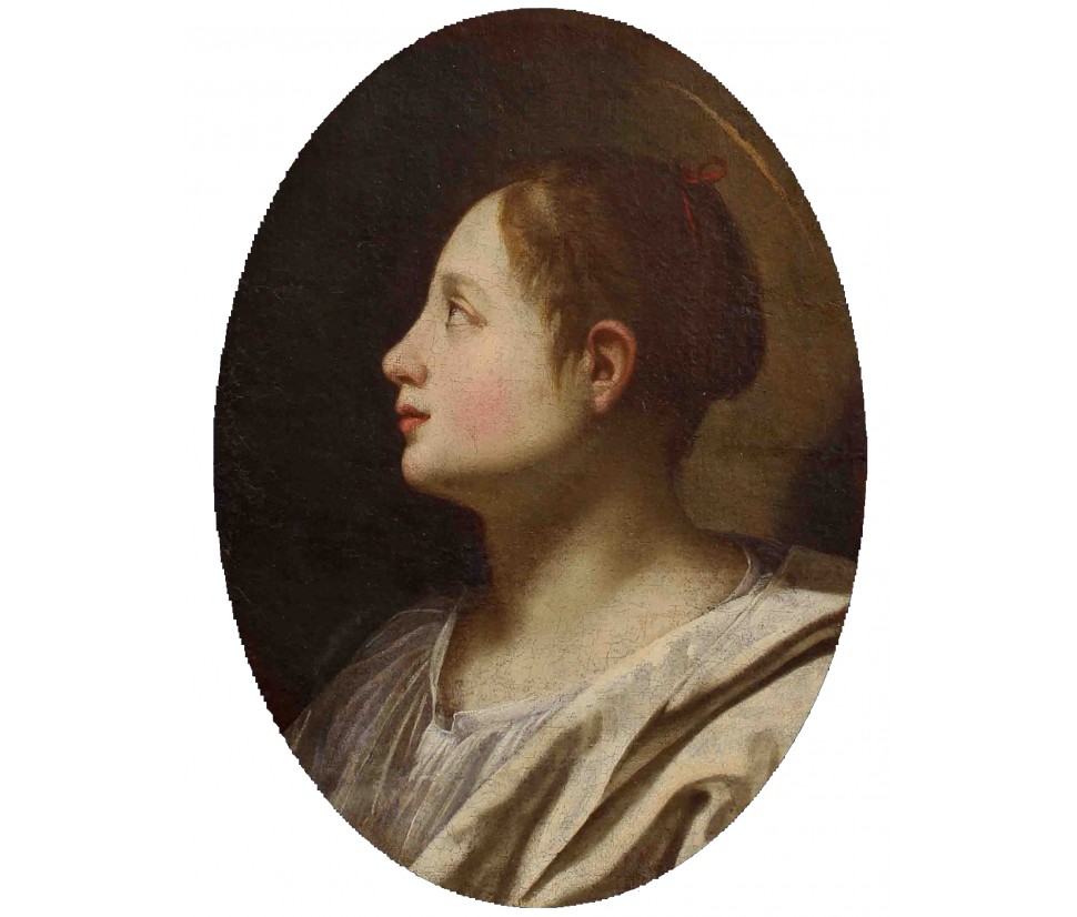 The work analyzed here proposes the profile portrait of a young figure; probably to be identified with the profile of a young Saint. The work shows strong stylistic and formal consonances with the painting of Saint Catherine of Alexandria kept in Rome, in the Quirinal Palace, made by Simon Vouet between 1615-16. The French artist trained in Italy (1613-27), initially in contact with the world of Caravaggio and on his return to France he became court painter, receiving commissions from Louis XIII and Cardinal Richelieu, introducing the taste of Italian Baroque. It was his father, the painter Laurent Vouet, who taught him the first rudiments of art, and he, at the beginning, dedicated himself to the execution of portraits. After a first trip to England, he was part of the retinue of the Baron of Sancy, Ambassador of France to Constantinople. He then began a long stay in Italy, visiting Venice and Rome. From 1620 to 1622, he was in Genoa at the service of the family of Prince Doria and also worked for Cardinal Barberini, the future Pope Urban VIII. In Rome, finally, Vouet was so successful that, in 1624, he was placed at the head of the Academy of San Luca. The cycle of San Francesco in San Lorenzo in Lucina is the commission that confirms his Roman success. But in 1627 he had to return suddenly to his homeland for the pressing requests of the Duke of Béthunes. Thus it was that Vouet imported into France the Italian Baroque style, in particular that of Paolo Veronese, Titian and Carracci, adapting it to the great decorations of the time of Louis XIII and Richelieu. He was appointed the king’s first painter, and Louis XIII commissioned portraits, cartoons, and paintings for the Louvre, Luxembourg, and Saint-Germain-en-Laye Castle. In 1632, he worked on the building of Cardinal Richelieu in the Cardinal’s Palace (now the Palais-Royal) and in the Château de la Malmaison. In 1631 he decorated the Castle of President de Fourcy in Chessy, the Hôtel Bullion, the Castle of Marshal d'Effiat in Chilly, as well as the Palace of the Duke of Aumont, the Séguier Chapel and the Gallery of Wideville Castle. Simon Vouet represented French Baroque painting and became an emblematic artist.