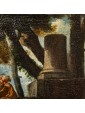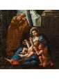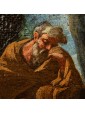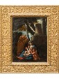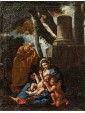 This Holy Family, with its exemplary composition in the form of a rest from flight to Egypt, is set within a shady bucolic backdrop, a natural and silent scenographic fifth. Saint Joseph, shown in a relaxed mood, seems to trace in the figure the parallel and suggestive half column caressed by a ray of sunshine, which penetrates into the shadowy wooded idyll.