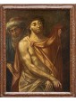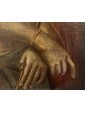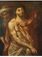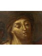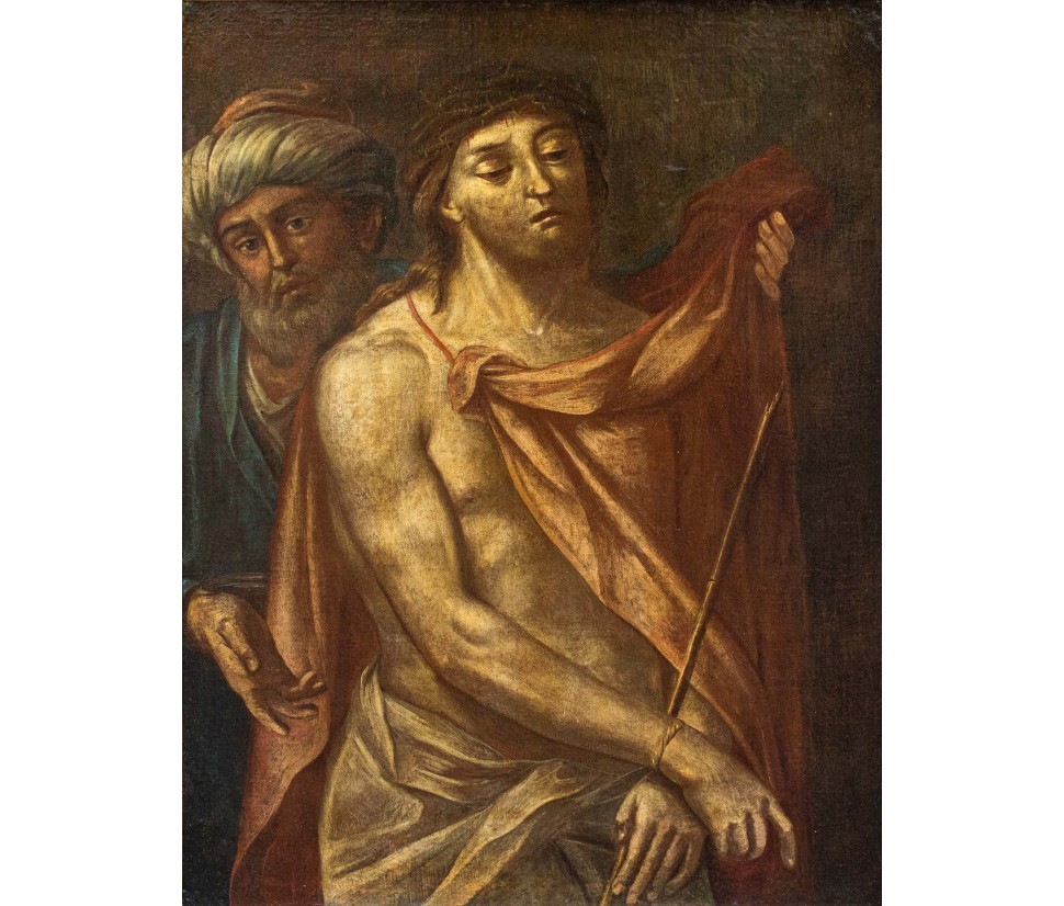 In the present painting is depicted the moment before the audience with Pilate. Christ has not yet been cruelly mocked by the soldiers, despite already wearing the crown of thorns and the purple cloak: he still does not have the wounds due to beatings. A man, with the typical Eastern turban, looks at the viewer revealing the tied hands of the Redeemer, simultaneously inviting a silent reflection about the destiny that is to be accomplished. The whole work is imbued with an intimate spirit of recollection, exalted by the dark background on which stands illuminated, and above all illuminating, the Christ.