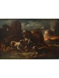 La tela in esame raffigura una lotta fra cani e un toro in cui si manifestano a pieno la potenza espressiva e la forza che la pittura del Crivellino può raggiungere. I tre cani, colti in pose diverse, ringhiando, con la bocca aperta sembrano circondare il toro in difficoltà. La pennellata è veloce, eppure definita, e vibra, trasmettendo ulteriore concitazione al dinamismo insito nella scena. La resa dei manti, di grande qualità, sembra viva, rendendo l'idea reale del pelo degli animali. Il toro, in difficoltà, sembra ruotare la testa pronto ad accasciarsi al suolo. Le dimensioni degli animali in lotta, sovrastano il paesaggio circostante, concentrando l'attenzione sul combattimento, per quanto di grande fascino risultino le rovine architettoniche e lo sfumare in lontananza del cielo. Una figura di pastore a passeggio intento ad osservare la scena da una certa distanza arricchisce ulteriormente la composizione.