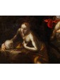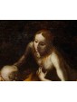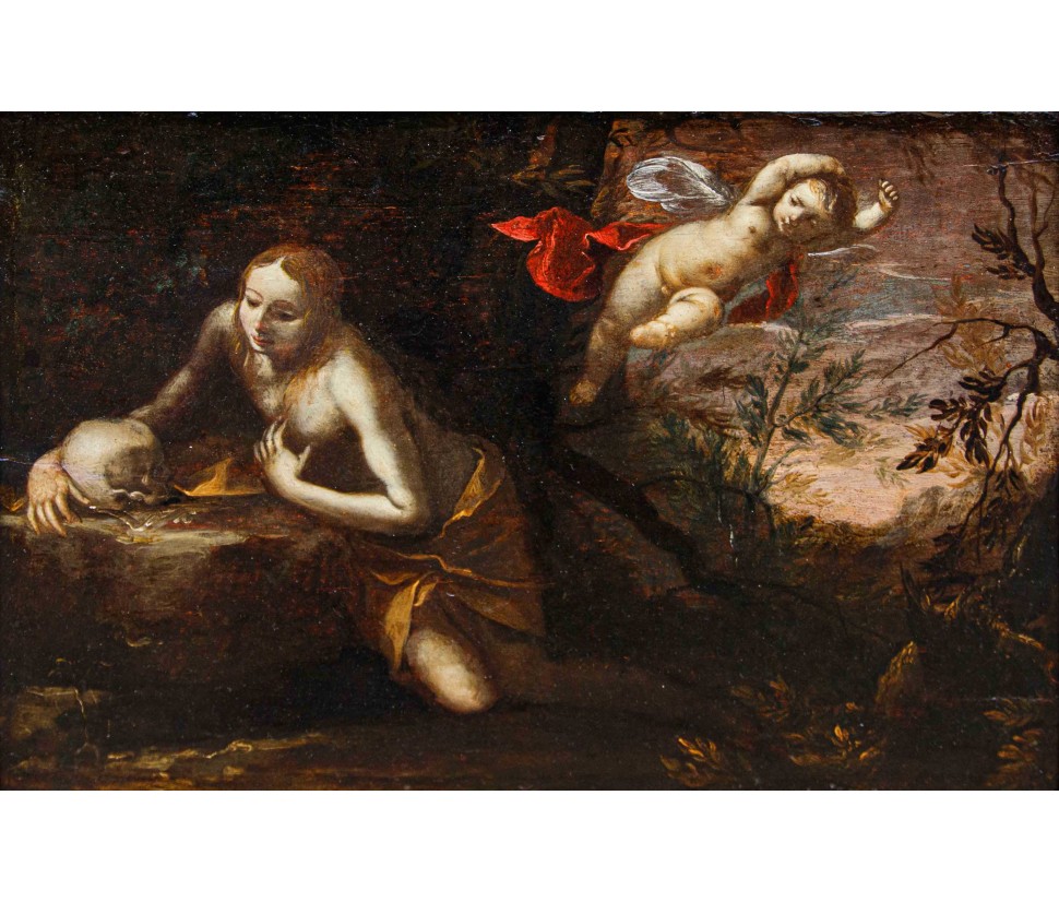 Non sorprende pertanto la presente elaborazione di un soggetto evocativo e potente come la Maddalena penitente nel deserto, qui concepita in un’ariosa composizione. In veste di solitaria penitente nel deserto, Maddalena raggiunge nel ’600 una formidabile fortuna e si trova spesso associata in pendant con Gerolamo, l’altro santo ritiratosi a vita eremitica. Entrambi esprimono la via dell’ascesi, l’allontanamento dai piaceri terreni e il sacrificio necessario per la salvezza. Sono figure del riscatto dalla vanità della vita umana in vista dell’eternità. È questo il significato del teschio, simbolo di morte e di redenzione, che è situato ai piedi della Maddalena. Appoggiata a un masso rialzato la Maddalena è ricoperta da un manto giallo, che ne lascia scoperto il busto. Alle sue spalle si apre un paesaggio memore delle aperture selvagge del pittore e un angioletto, unica altra presenza.
