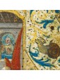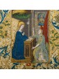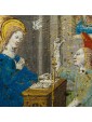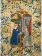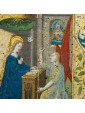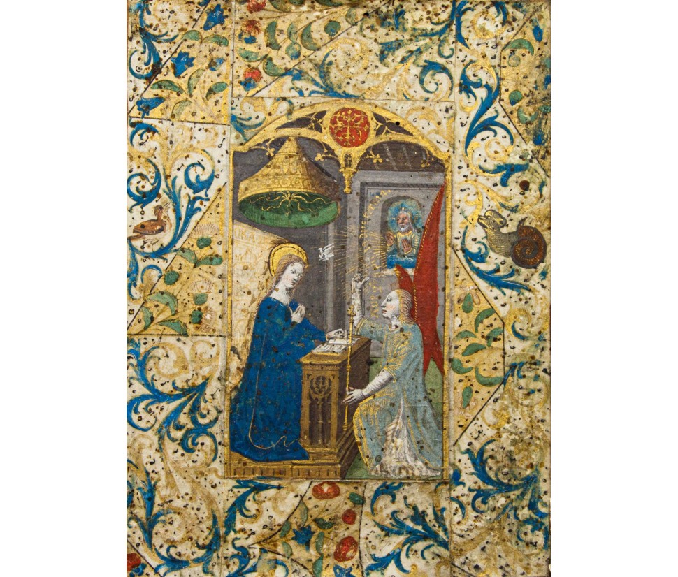 La miniatura è un'arte che ha rivestito una grandissima importanza nella produzione artistica europea e mediorientale. La sua storia, in alcuni casi parallela a quella della pittura, va dall'antichità, in particolare, per l'Europa, dal II secolo, sino al tardo Rinascimento, quando la diffusione della stampa permise di creare illustrazioni in serie a prezzi maggiormente accessibili. La miniatura esiste fin dall'epoca del papiro ma è nella tarda antichità, con la comparsa del libro, che parole e immagini arrivarono a fondersi in una perfetta convivenza. La miniatura rappresenta per molti secoli la principale fonte per ricostruire l'arte pittorica, essendo quasi completamente perdute o manomesse le testimonianze di affresco, pittura su tavola o su altri supporti. Inoltre, i codici miniati, essendo costosissimi prodotti di lusso, erano spesso legati alla più alta committenza sia religiosa che laica, preservando traccia del gusto più raffinato di quelle epoche. Fra il XIV e XV secolo, grazie alle trasformazioni socioculturali ed al graduale diffondersi dell'alfabetizzazione, la produzione dei manoscritti conobbe una diffusione mai sperimentata prima. Oltre ai libri religiosi, che raggiungono punte di sfarzo mai toccate prima, si diffusero i libri scientifici anche divulgativi (medicina, botanica, geometria), narrativi, di poesia (come I Trionfi del Petrarca), di viaggio e i classici. Un nuovo tipo di libri votivi furono i Libri d'ore, nati per l'uso personale per raccogliere le preghiere e le orazioni che il buon cristiano doveva pronunciare nel corso della giornata e nelle principali festività della religione cattolica, che contenevano illustrazioni finemente miniate. La decorazione di questi libriccini si separò dai vincoli convenzionali che il carattere religioso dei libri aveva precedentemente imposto. L'utenza a cui erano destinati era la più disparata, con un evidente scarto in qualità e prezzo. Alcuni caratteri fino ad allora specifici della miniatura (gusto ornamentale, bidimensionalità, unitarietà del foglio) vennero presto superati favorendo un allineamento con la pittura coeva, anzi spesso anticipandone alcune rivoluzioni, come il caso della spazialità nelle miniatura francesi e fiamminghe prima del Rinascimento delle Fiandre. In questi due paesi la produzione miniata tendeva ad esibire grande libertà nelle composizioni: la pagina sembrava sfondata dalle costruzioni spaziali più ardite, come si può osservare per quanto concerne il Libro d'ore di Maria di Borgogna, le illustrazioni diventavano finestre aperte su una scena e i paesaggi raggiungevano una profondità mai vista, come si vede in Les Très riches heures du Duc de Berry dei Fratelli Limbourg, nel libro delle ore del cosiddetto Maestro di Boucicant e nel libro delle ore del Maestro di Bredford. È proprio da un libro delle ore che proviene questa miniatura presentante l’episodio dell’Annunciazione e recante preziosissime decorazioni realizzate con rari e pregiati pigmenti: ciò ci fa presagire che la committenza dell’opera fosse assolutamente di alto livello. Il miniatore che si occupa dell’esecuzione della scena, identificato con l’anonimo maestro Jacques de Besançon, attivo in Francia nell’ultimo trentennio del XVI secolo, riesce a fornire all’immagine un marcato senso di spazialità e profondità, non scontato per quanto concerne l’elaborata tecnica della miniatura. Il cosiddetto Maestro Jacques de Besançon è un anonimo miniatore che fu attivo in Francia, e, più precisamente, a Parigi tra il 1478 e il 1500. La critica lo ha identificato in François Barber, figlio di François Barbier, alias il Maestro Francesco. Abbiamo a che fare con un artista gran lavoratore, la cui produzione generò un gran numero di libri di ore, così come vari manoscritti per la nobiltà. Sul finire della sua attività ha decorato incunaboli e grandi testate, soprattutto per l'editore Antoine Vérard. Documenti d'archivio indicano che nel 1478 l'autore risiedeva nella parrocchia di San Cristoforo sulla Île de la Cité ed era inquilino di una casa detta dell'asino a righe, che era di proprietà del capitolo di Notre Dame. Fu uno dei rari borghesi ad essere ammesso nel 1485 alla confraternita di Sant'Agostino che aveva la sua sede nella cattedrale. Nel 1488 lasciò un legato per una messa a Parigi nel convento dei Celestini. Si crede che sia deceduto nel 1501. Fu vicino al capitolo di Notre Dame per cui realizzò diversi messali e seppe esprimere costantemente un alto livello di vita e di riconoscimenti lavorando anche per il re di Francia.