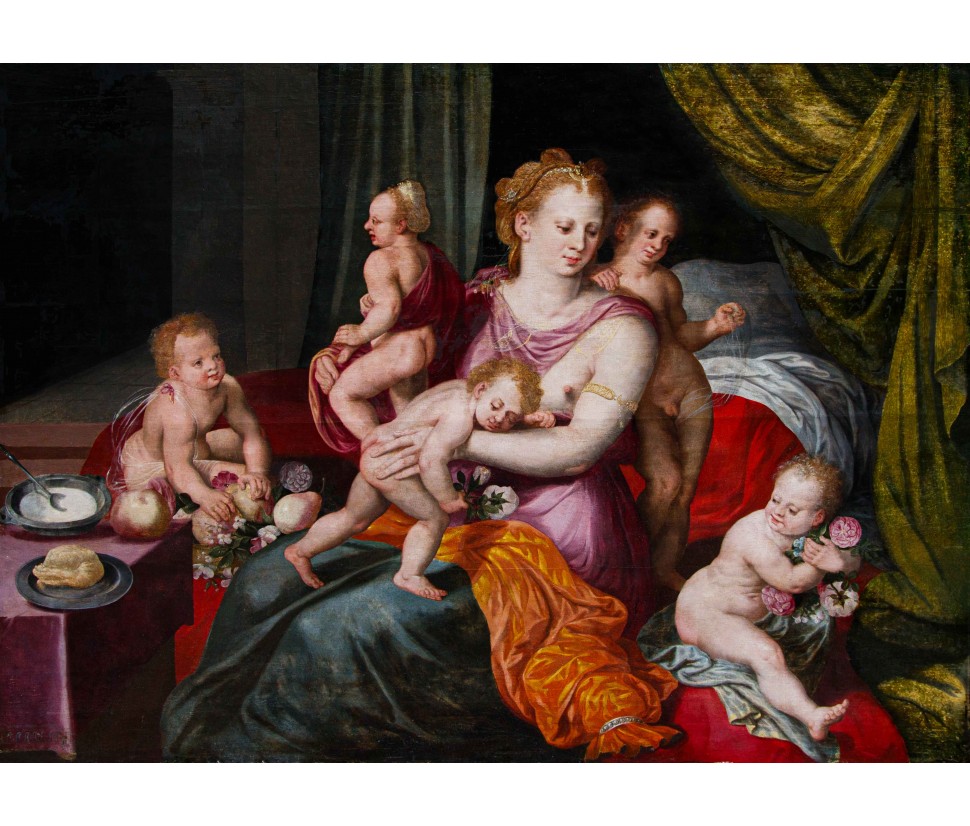 Il dipinto raffigurante la "Caritas" attribuito a Frans de Vriendt, detto Frans Floris (Anversa, 1517 –1570), offre un interessante esempio di come gli artisti si siano confrontati con soggetti a lungo consolidati nella tradizione pittorica. La Caritas, una delle virtù cardinali, è stata infatti rappresentata in numerose opere, tra cui stampe di artisti come Beham, Goltzius, Matham, Maerten de Vos e molti altri.