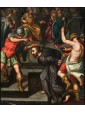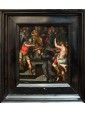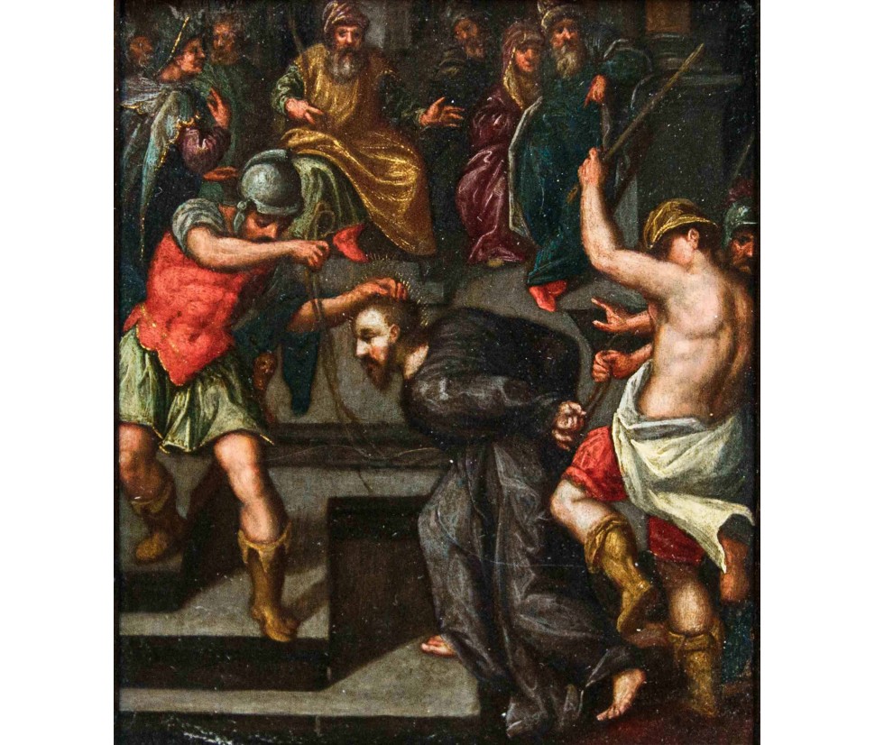 L’opera illustra uno dei momenti più carichi di tensione drammatica della Passione: il processo notturno di Gesù presso la dimora del Sommo Sacerdote Caifa, così come narrato dal Vangelo di Matteo (26, 57-68). Dopo l'arresto nel Getsemani, Cristo viene condotto dinanzi al Sinedrio per essere giudicato. Il testo sacro sottolinea il contrasto tra l'agitazione febbrile degli accusatori, alla ricerca di una “falsa testimonianza”, e il dignitoso silenzio di Gesù, che rompe il riserbo solo per confermare la propria natura messianica: «Tu l'hai detto; anzi io vi dico: d'ora innanzi vedrete il Figlio dell'uomo seduto alla destra della Potenza». In questo prezioso olio su rame, l’artista traduce la concitazione del racconto evangelico attraverso una composizione dinamica e compressa. La figura di Cristo, baricentro spirituale della scena, è colta nel momento della massima umiliazione: spinto e trattenuto per i capelli da scherani in vesti classicheggianti, egli incarna l’immagine del “Servo sofferente”. La sua veste scura e il capo reclinato contrastano con la gestualità teatrale di Caifa, che siede in alto sul trono, simbolo di un’autorità terrena che interroga la Verità senza riconoscerla. Il dipinto segue fedelmente il versetto 67 del Vangelo di Matteo: “Allora gli sputarono in faccia e lo schiaffeggiarono; altri lo bastonavano”. Il modello per questa composizione è l'acquaforte di Dirck Volkertsz Coornhert, basata sull'invenzione di Maarten van Heemskerck, l'artista che più di ogni altro seppe declinare il linguaggio muscolare e architettonico del Rinascimento romano nelle Fiandre. Celebre è la serie incisoria del 1545 chiamata La caduta e la salvezza dell'umanità attraverso la vita e la passione di Cristo: composta da 30 tavole (acqueforti e incisioni), la serie non si limita alla Passione, ma narra l'intero arco della redenzione cristiana iniziando con il Peccato Originale e attraversando i momenti salienti della vita di Gesù per culminare nella sua morte e risurrezione. La bottega di Peter Stas era specializzata nella battitura delle lastre di rame destinate ai pittori. Nel corso del Seicento una parte considerevole dei dipinti prodotti ad Anversa veniva venduta ed esportata verso la Penisola Iberica. Le fonti documentarie attestano numeri impressionanti: i registri di carico di alcune navi, giunti fino a noi, testimoniano l’invio di grandi quantità di dipinti, in larga parte eseguiti proprio su rame. Questo supporto era infatti particolarmente adatto all’esportazione, poiché consentiva formati più ridotti rispetto alle tavole lignee ed era al contempo più resistente ai lunghi viaggi via mare e alle intemperie. Nel 1602 risultavano registrati ben venticinque maestri battitori di rame nella gilda dei fabbri di Anversa. Nel 1584 i fabbri protestarono contro l’imposizione di una tassa del 5% su tutte le merci esportate verso le regioni settentrionali della Zeelanda e dell’Olanda. Molti artigiani minacciarono di trasferirsi in altre città, inducendo le autorità a giungere a un compromesso: l’amministrazione accettò di abolire la tassa a condizione che i fabbri apponessero un marchio identificativo sulle opere destinate all’esportazione. Un’ulteriore e non meno rilevante motivazione per l’introduzione dei marchi fu la necessità di contrastare la proliferazione di botteghe non registrate presso la gilda, dunque illegali, che operavano sia all’interno della città sia all’estero, creando una forma di concorrenza sleale. I marchi garantivano una tutela sia per l’artigiano sia per il pittore che decorava la lastra, offrendo protezione contro frodi, falsificazioni e realizzazione di copie non autorizzate, e al tempo stesso assicurando agli acquirenti uno standard qualitativo più elevato. Essi svolgevano inoltre un ruolo essenziale nei mercati di esportazione, poiché consentivano di identificare con chiarezza il produttore delle lastre di rame. Tra le opere marchiate con il simbolo di Peter Stas, la più antica oggi nota è databile al 1587, mentre la maggior parte della produzione si concentra nel primo decennio del XVII secolo. Uno studio pubblicato nel 1998 e dedicato alle opere in rame uscite dalla bottega di Peter Stas riferisce che sono giunte fino a noi complessivamente settantanove opere recanti il monogramma completo, costituito dal simbolo della bottega associato al segno della mano. In tale contributo è stata proposta una cronologia della produzione e una catalogazione delle opere, ordinate in base alle dimensioni dei simboli impressi sul retro delle lastre. Seguendo i criteri di questo studio, l’opera in esame può essere collocata nel primo decennio del XVII secolo, più precisamente tra il 1602 e il 1605.