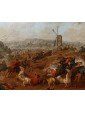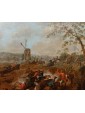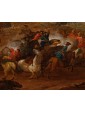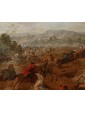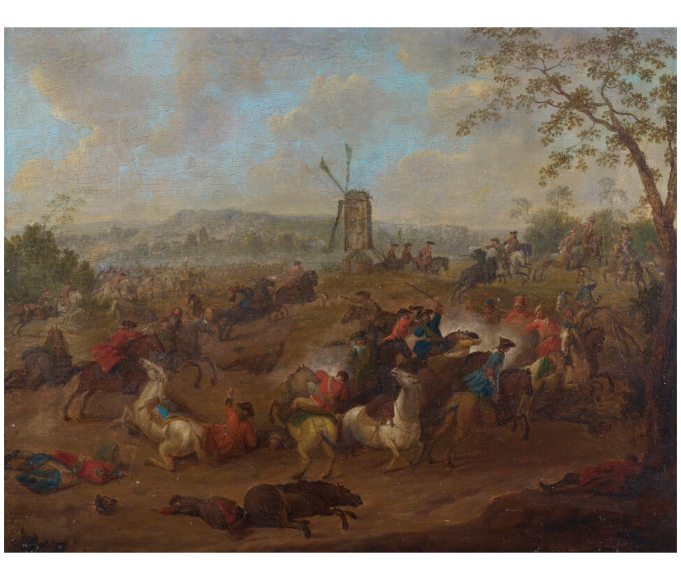 Il dipinto in esame, un raffinato olio su tavola di piccolo formato, rappresenta una scena di scontro tra cavalieri che, per stile, tecnica e dinamismo compositivo, è da ricondurre alla mano di Karel Breydel, celebre maestro fiammingo noto con l’appellativo di "Cavaliere d’Anversa". L’opera si inserisce perfettamente nel filone della pittura di battaglia, genere in cui Breydel eccelse, dimostrando una rara capacità di coniugare la concitazione del combattimento con l'ampiezza e la serenità del paesaggio nordico. La composizione si articola su un primo piano dominato da un violento corpo a corpo: la resa dei cavalli, colti in pose plastiche e frementi, e il dettaglio delle uniformi dei cavalieri evidenziano una perizia esecutiva che trova puntuali riscontri nelle opere del maestro conservate presso il Museo Nazionale di Copenaghen. In particolare, la fisionomia delle figure e la muscolatura degli animali rivelano quella cifra stilistica che rese Breydel uno degli interpreti più ricercati del suo tempo.